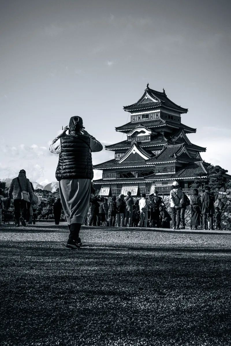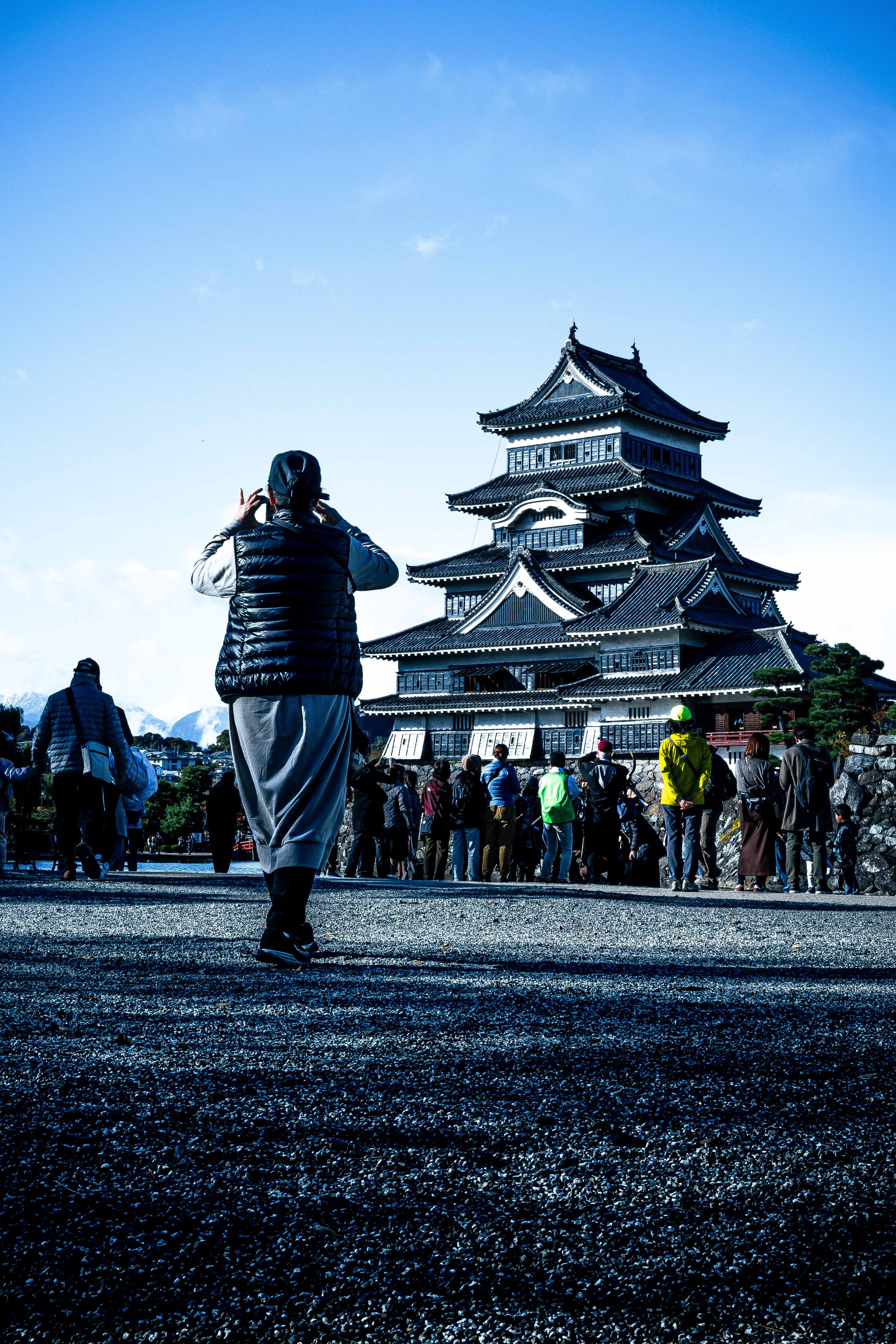 投稿を表示大胆な構図でとても良いですね。松本城とそれを見る人、いい感じの切り取りです。