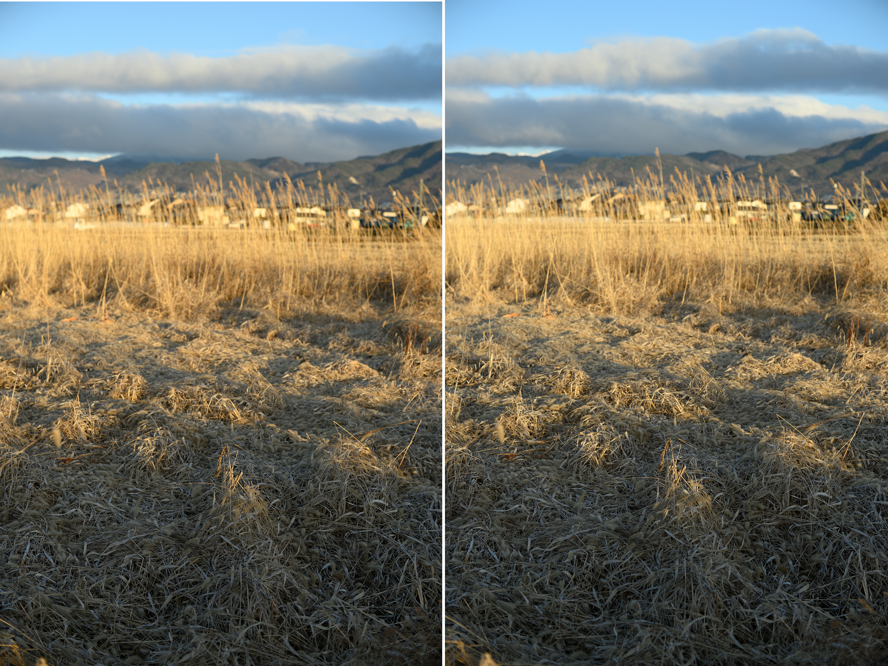 拡大して拝見しますと、左の方が合焦点(おそらく下三分の一くらいの中央の陽の当ったところ)から奥にかけてのボケ方がスムーズなように思えます。右の方は、シャープな範囲が広いといいますか、すぐうしろの日の当たったところまでシャープな感じに見えます。