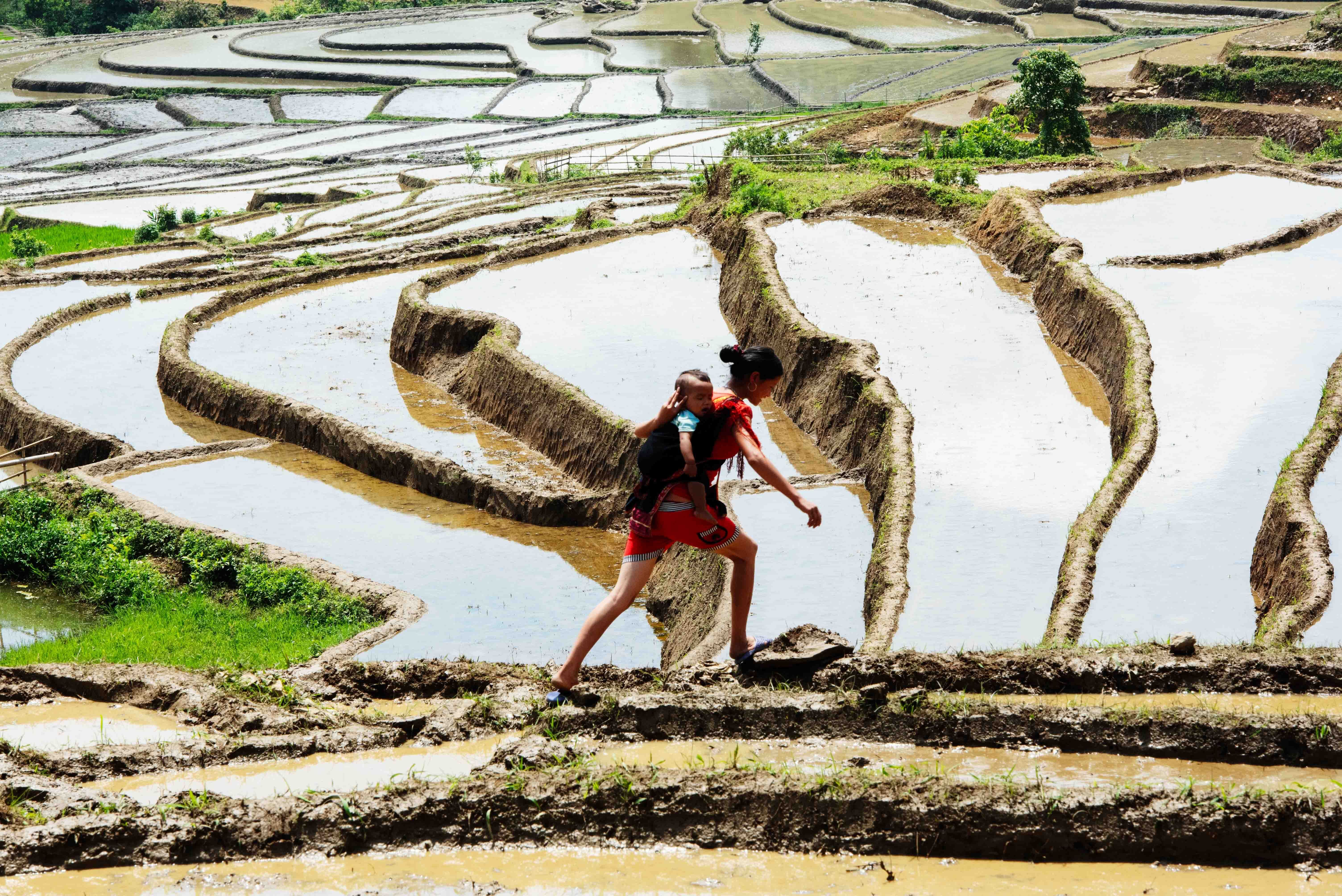 投稿を表示田の畔を大股で急ぎながらも赤ちゃんはを左手でしっかり支え農夫と母親の両方の面が見えます。