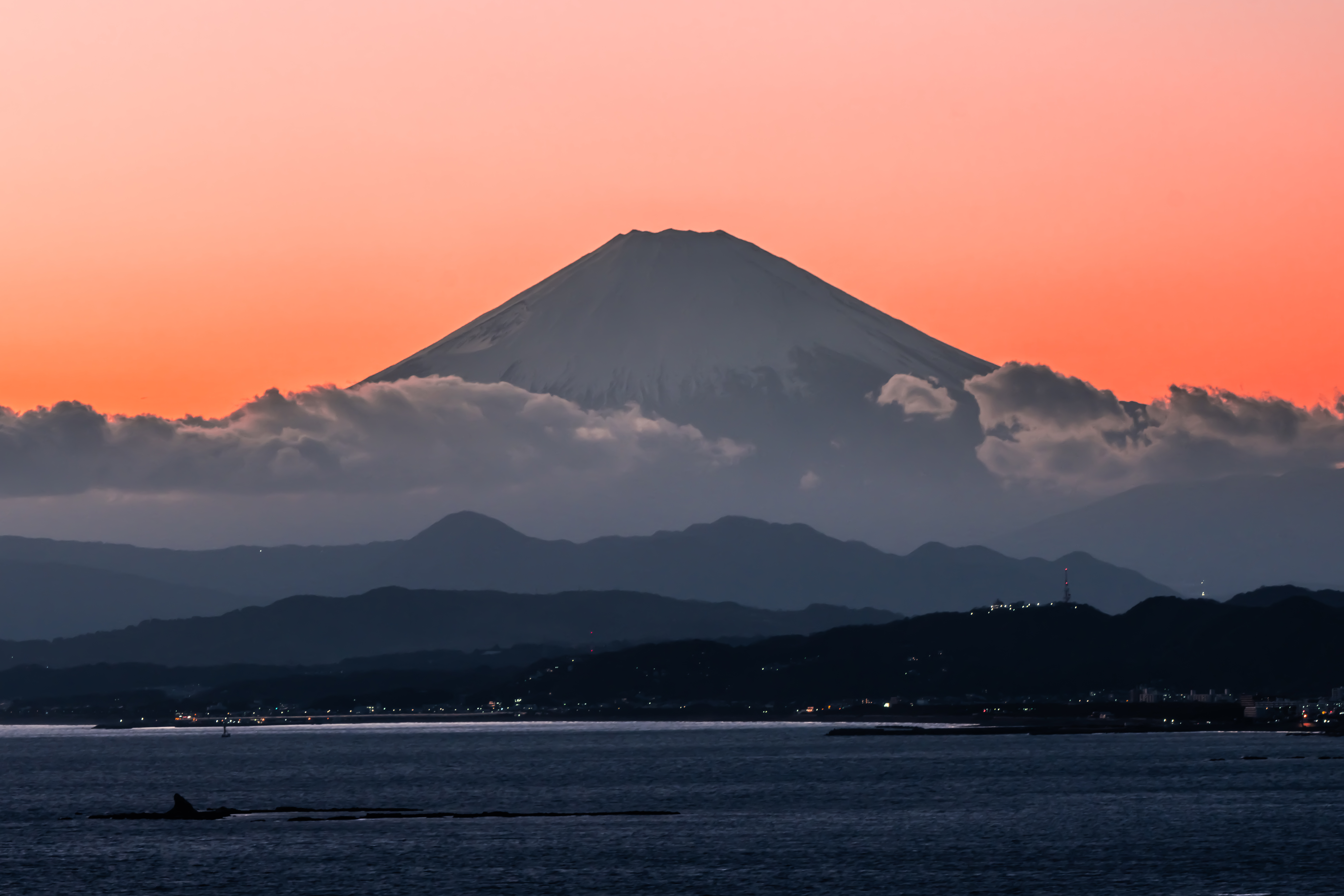 投稿を表示江の島からでしょうか?手前に烏帽子岩が見えていますね~。素敵な湘南の夕暮れ時の富士山、素敵な作品です。^^