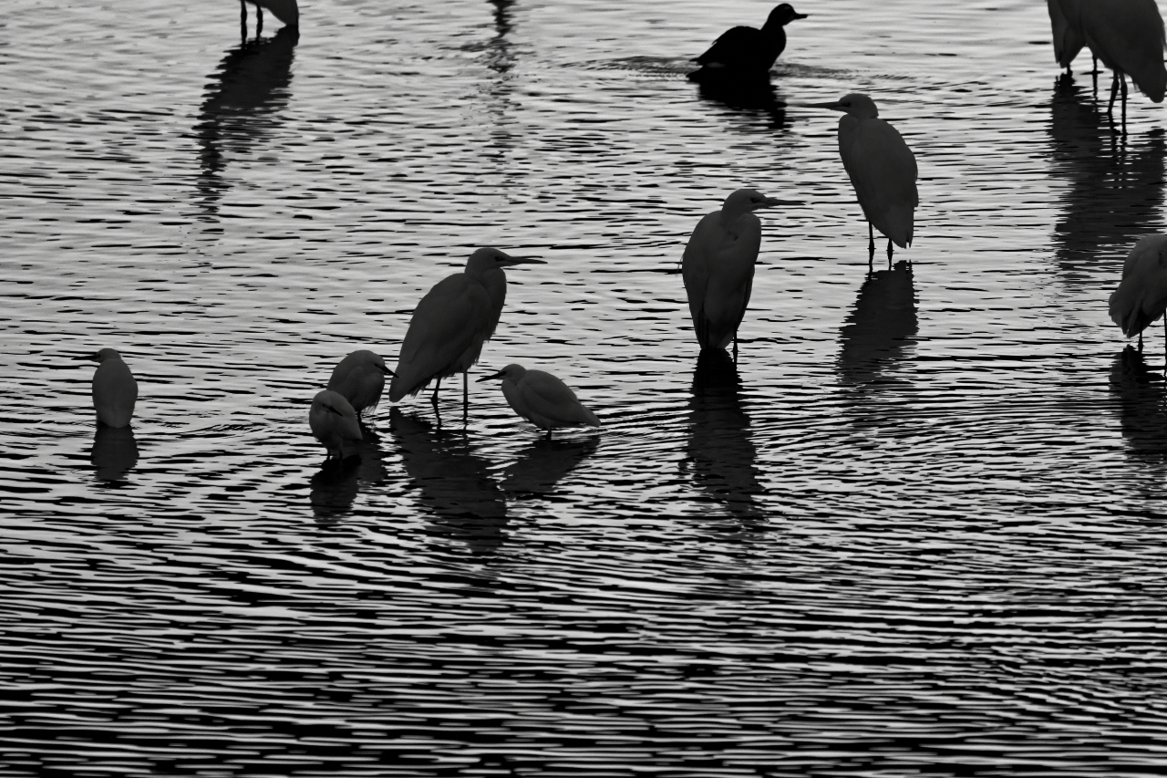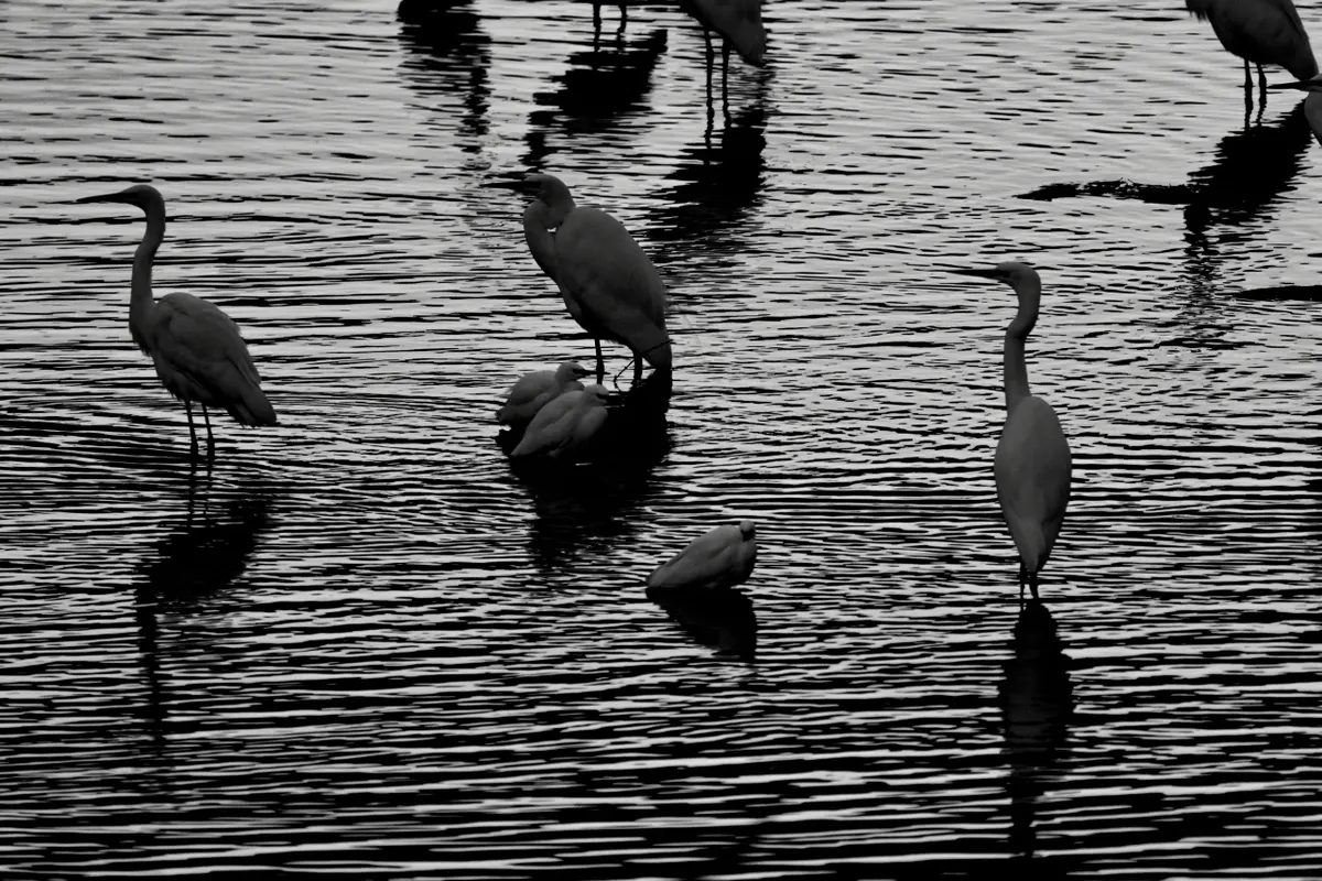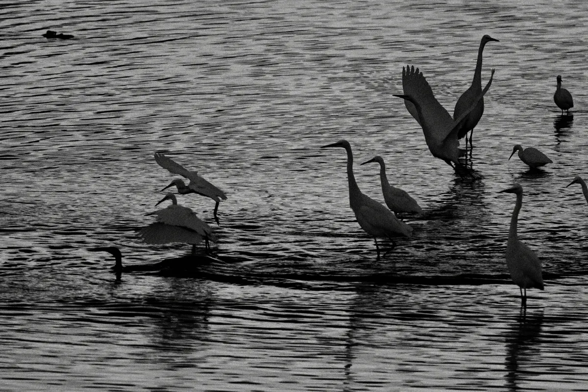 若鳥というにはまだ小さい幼鳥を連れたダイサギが群れをなしていました。夢中になって大量に撮ったのですが、そもそも構図が悪い、暗い、フィルムグレインをかけていないのに、かかっているように見えてしまうと散々な結果に。それでも、数枚ぐらいはなんとか救う方法はないかとモノクロにしてみました。苦し紛れもいいとこですw
