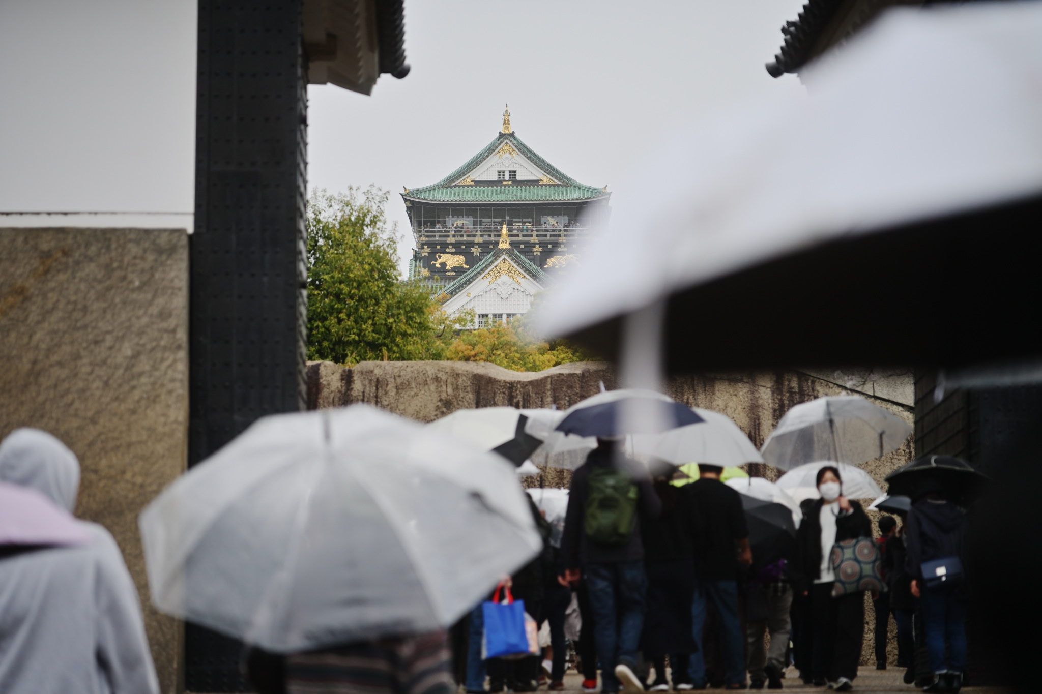 ようやく天守閣が見えてきました。みなさん、傘さしてますね。