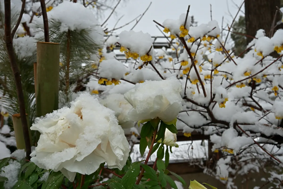 投稿を表示白い牡丹が雪化粧、美しい姿ですね~。美しく珍しい光景をありがとうございました。^^