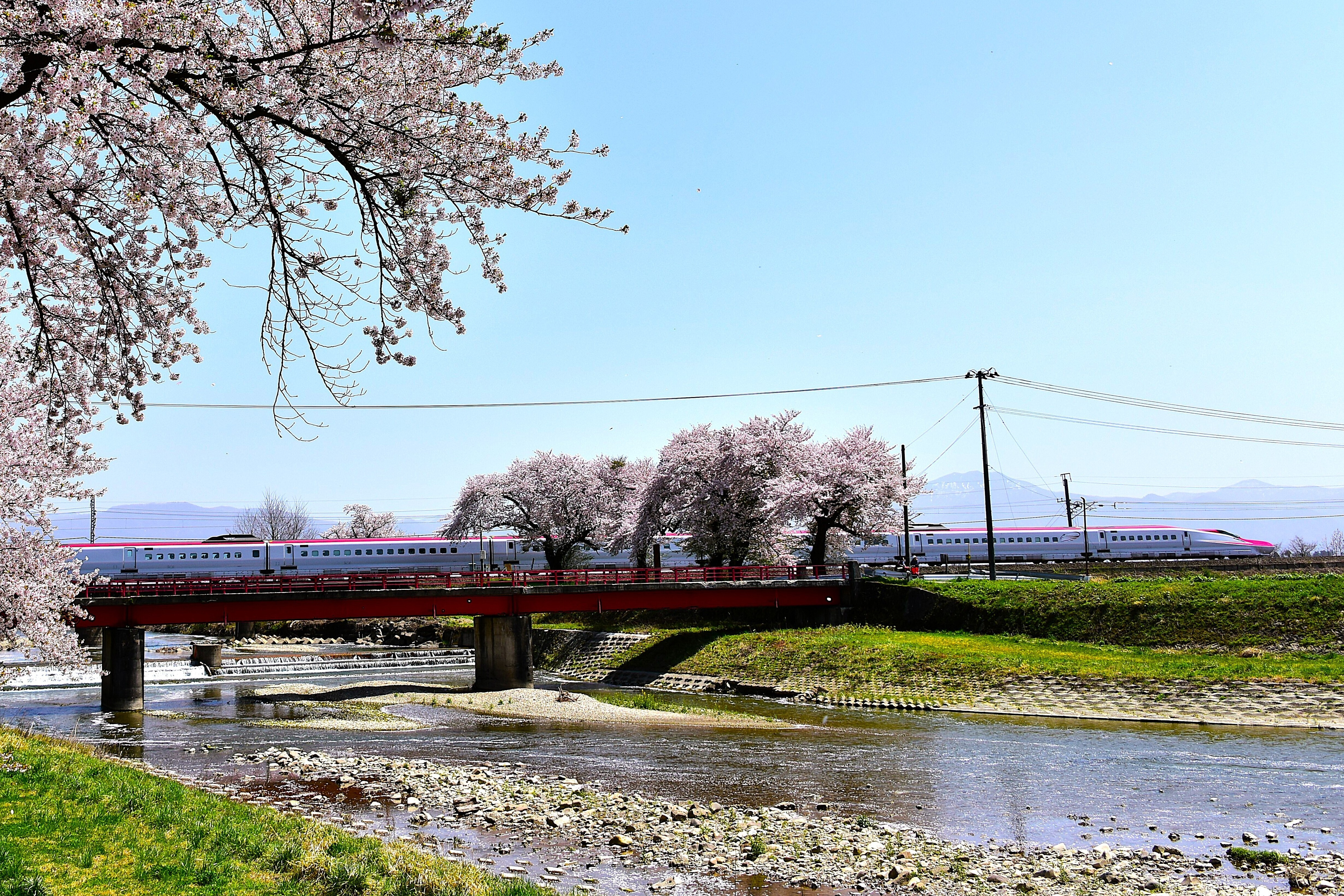桜と、新幹線のこまちがマッチしている素敵な作品ですね🌸