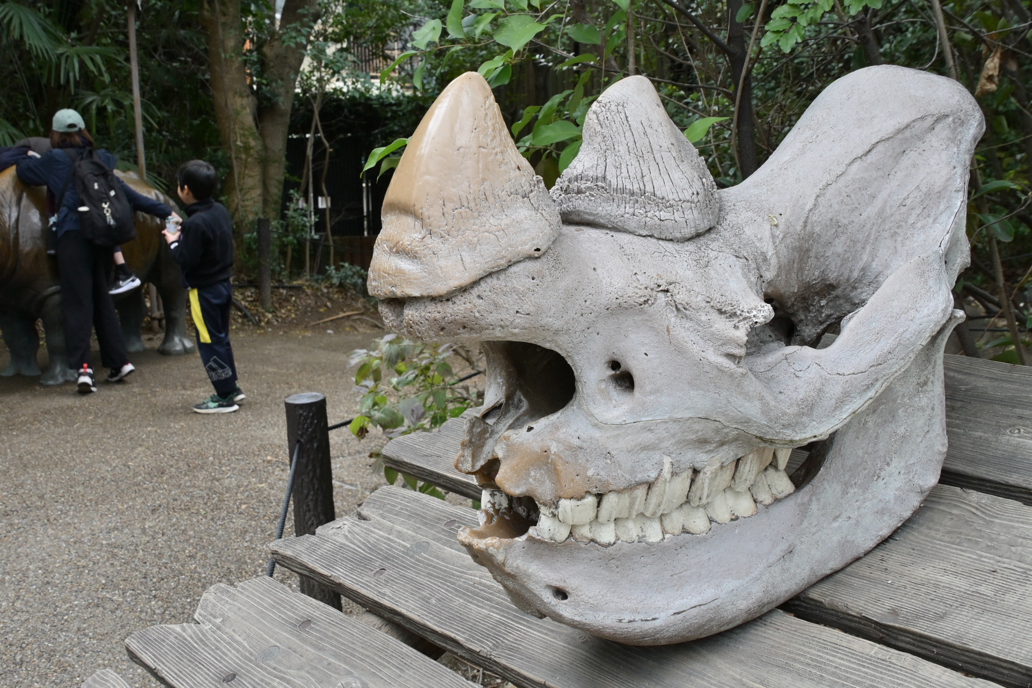 サイ舎を出たところには、頭の部分の骸骨が置いてありました。なんとも角がすごいですね。