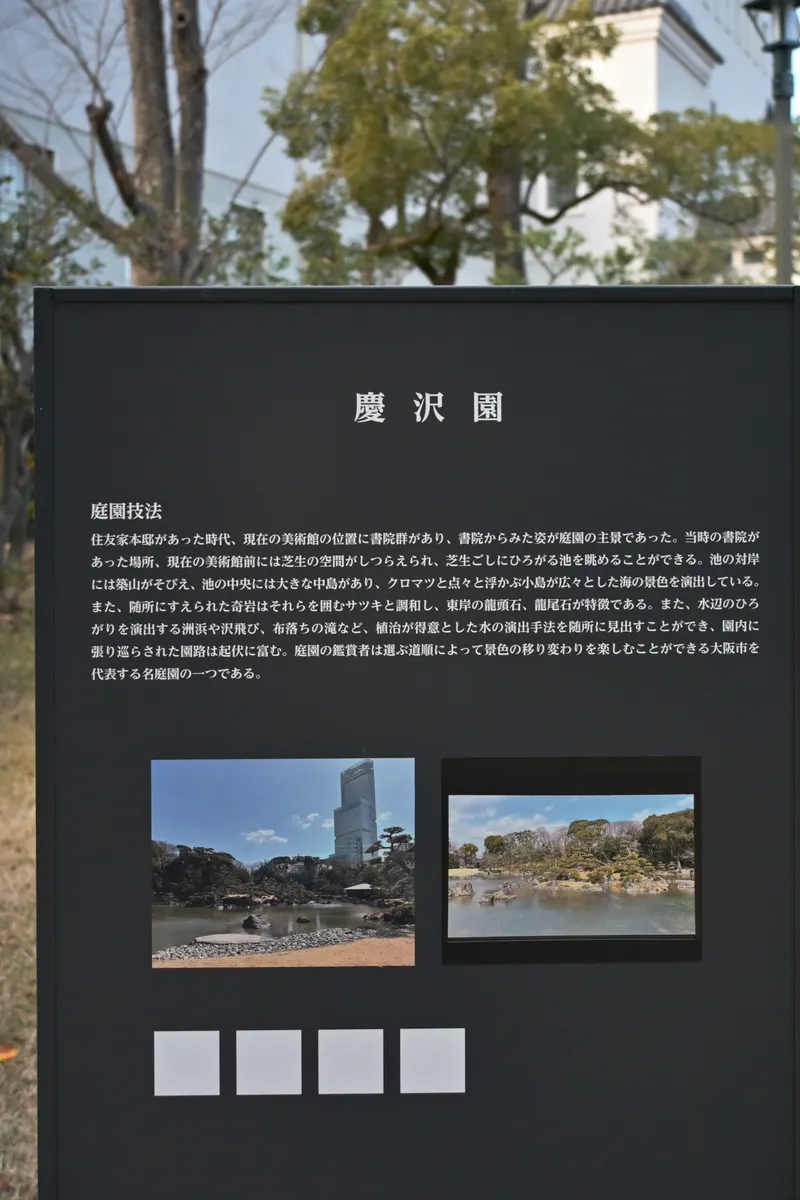 「慶沢園は、1926年(大正15年)に、江戸時代から続く大阪の豪商住友家15代住友吉左衛門友純(号は春翠)から、本邸とともに大阪市へ寄贈されました。」(慶沢園のHPの説明より)