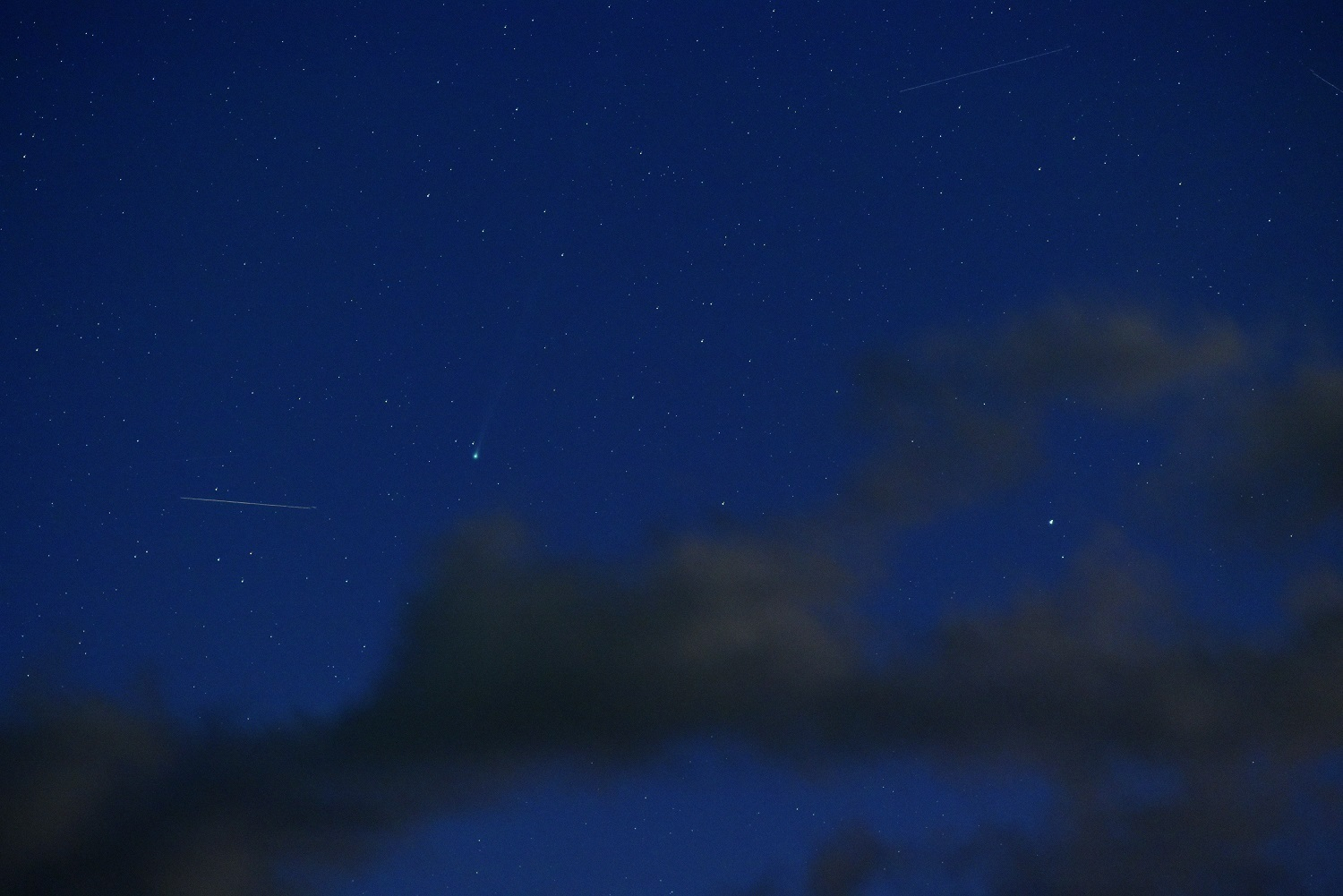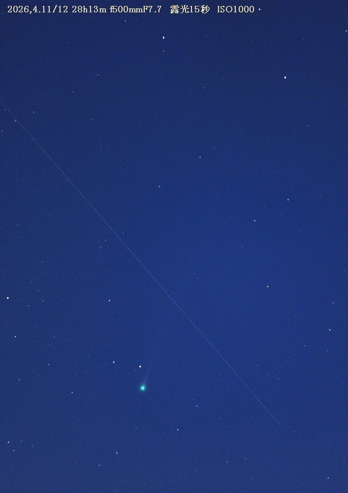 昨年のレモン彗星程度の明るさになりそうですが、残念ながら高度が低いので北半球からは最盛期の明るさを見ることは出来ないでしょう。彗星が昇る頃に雲が湧き出て空が明るくなって雲にすき間が出ました。彗星左側の線状の光跡は人工衛星と思われますが、右端に大きなシャッターブレが出ました。アイチャッチ画像のデータはf180mmF2.8絞り4露光5秒ISO1600です。肉眼ではかなり空の暗い所でないと確認できないと思われます。しかし画像では良く写る明るさになってきました。高度が下がるので撮影は17日あたりまででしょう。