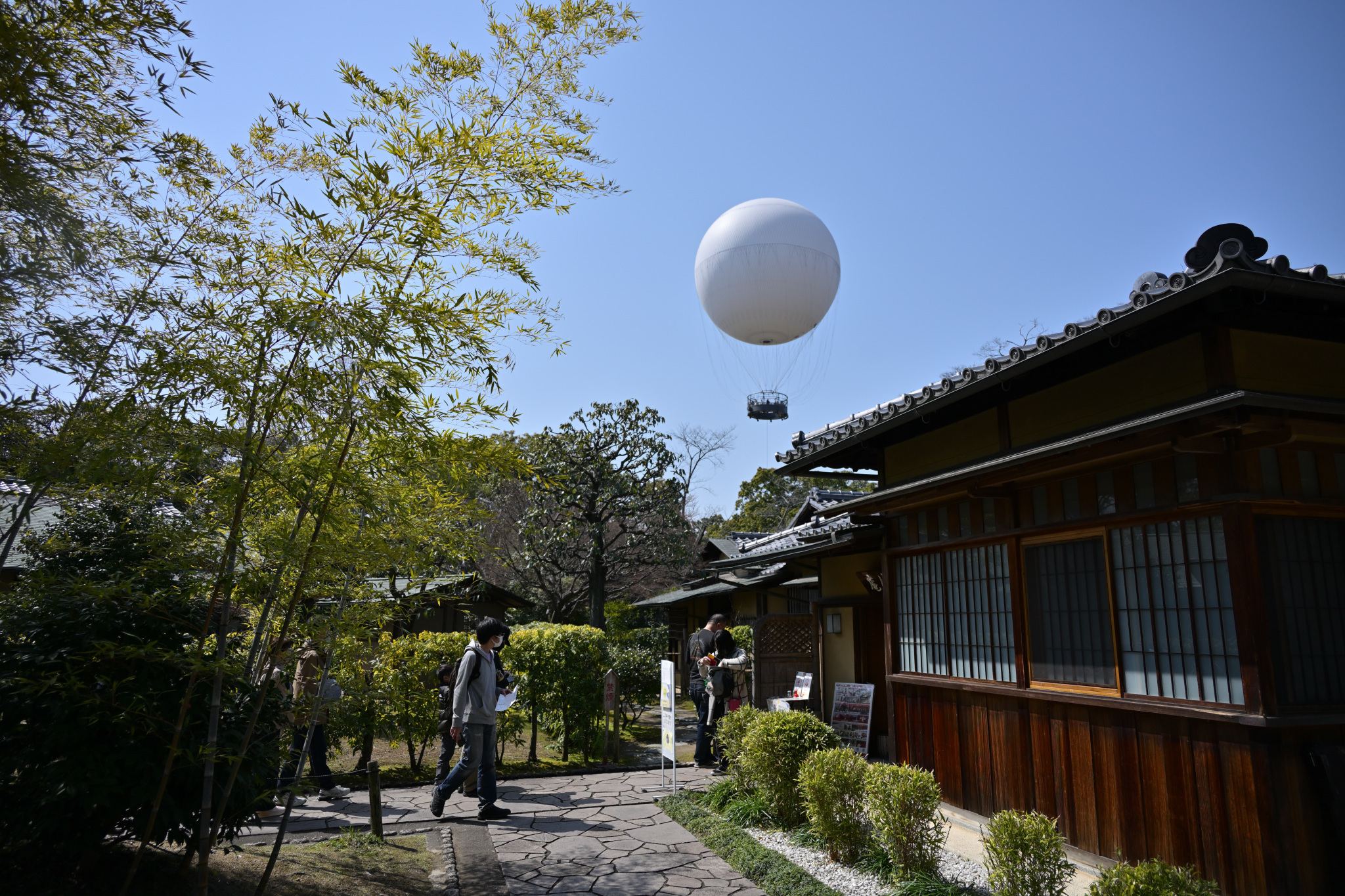 外から茶室を眺めたところ(右手が茶室のある建物です)。バルーンが見えてますね。あと、スタンプ目当ての人が並んでました。