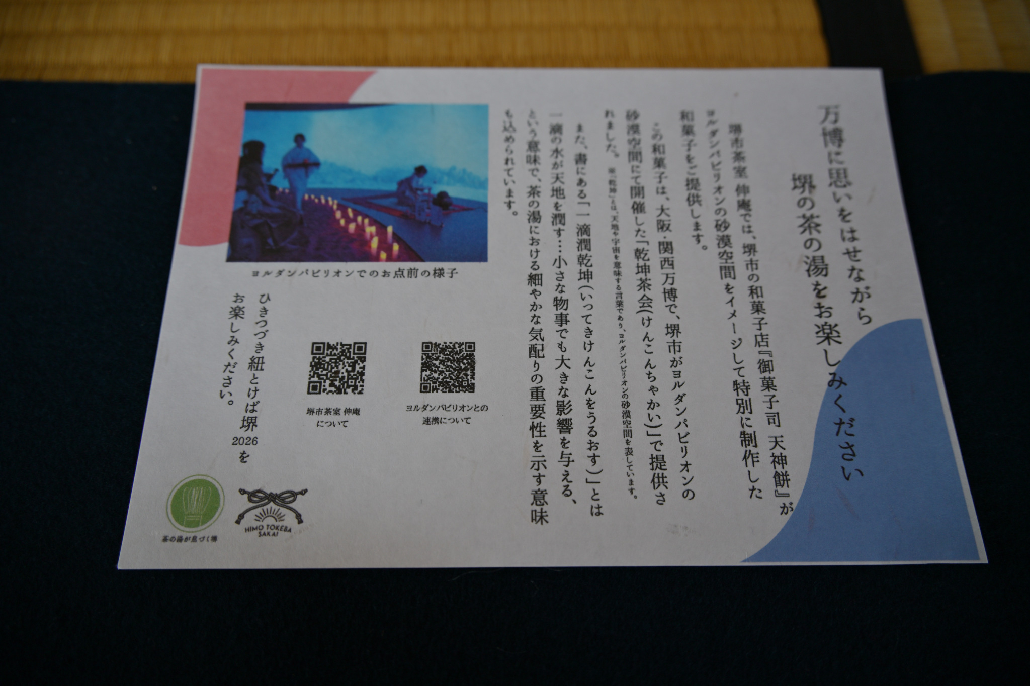 「紐とけば堺」の座席は1,000円と通常の倍ですが、関西万博にちなんだ主菓子(水分を多く含んだ生菓子のこと)と、同じく関西万博で振る舞われたお茶碗を楽しめる良い機会なので、特段高くはないですね。