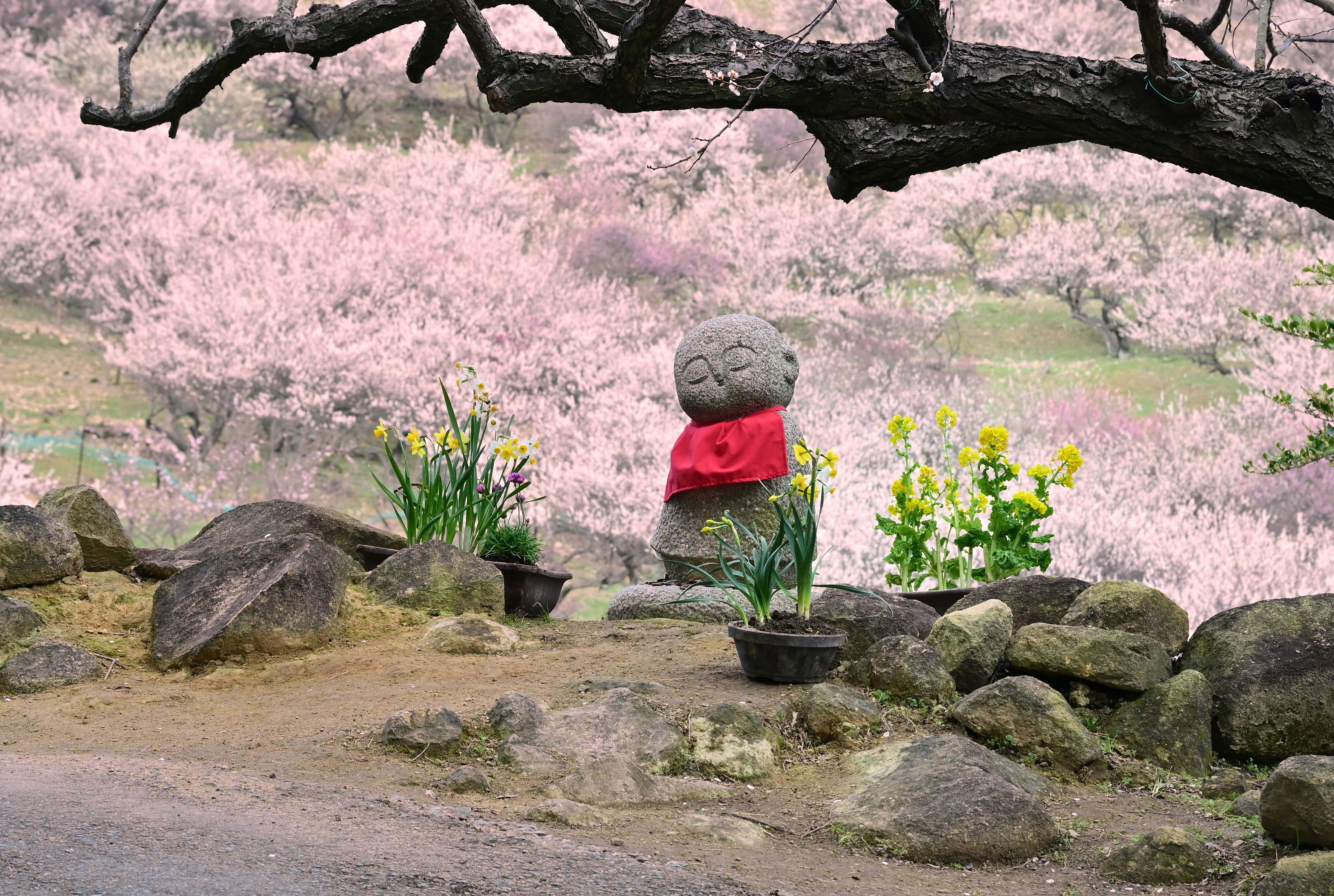 投稿を表示梅林に可愛らしいお地蔵さんの姿、菜の花と水仙が添えられて春一杯の素敵な光景ですね。素晴らしい切り取りです。^^