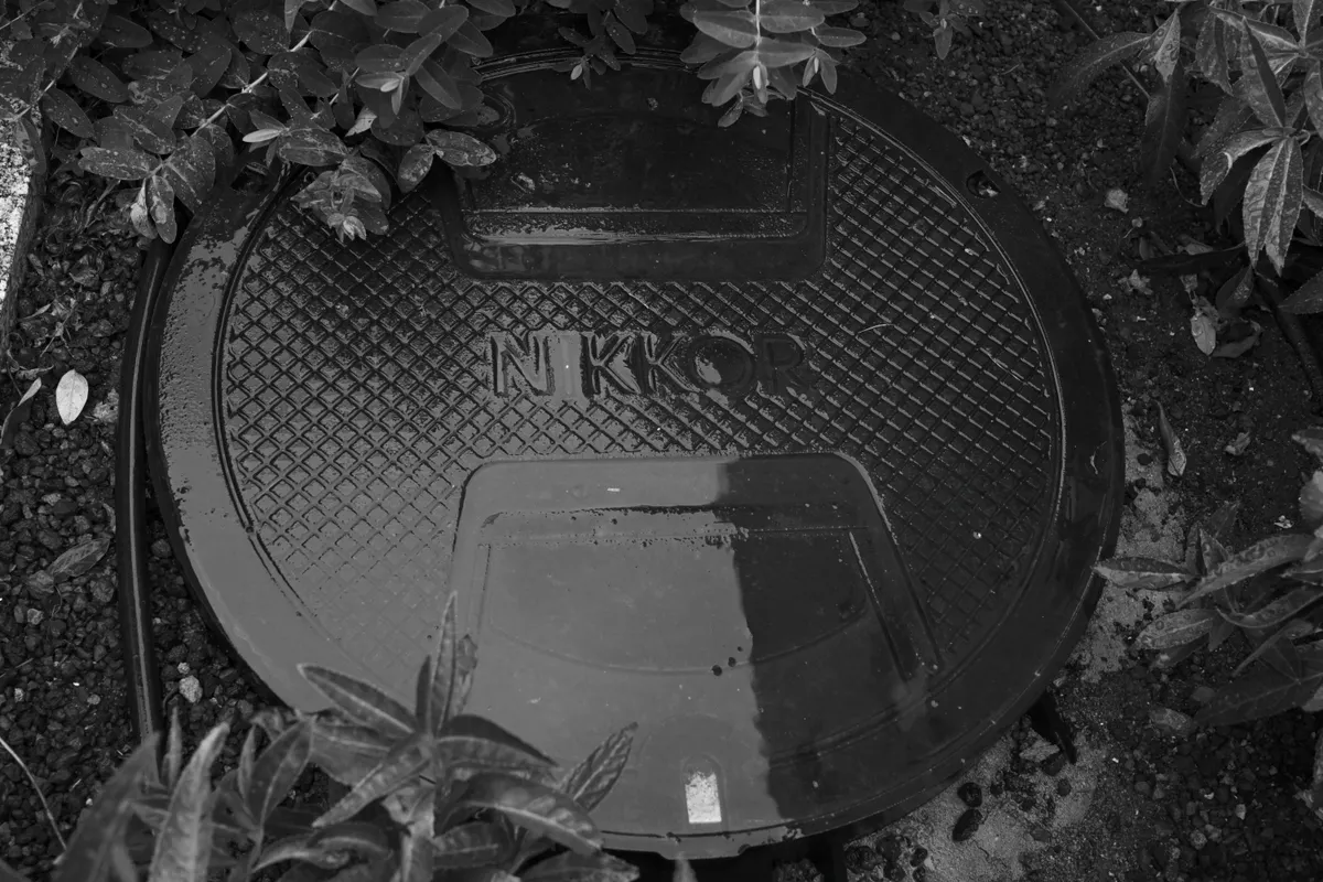 この画はモノクロで撮る意味がほぼないと思いますが(苦笑)、レンズキャップデザインのマンホールが本社敷地内にあると聞き、ワークショップ参加者全員で向かった成果です📸