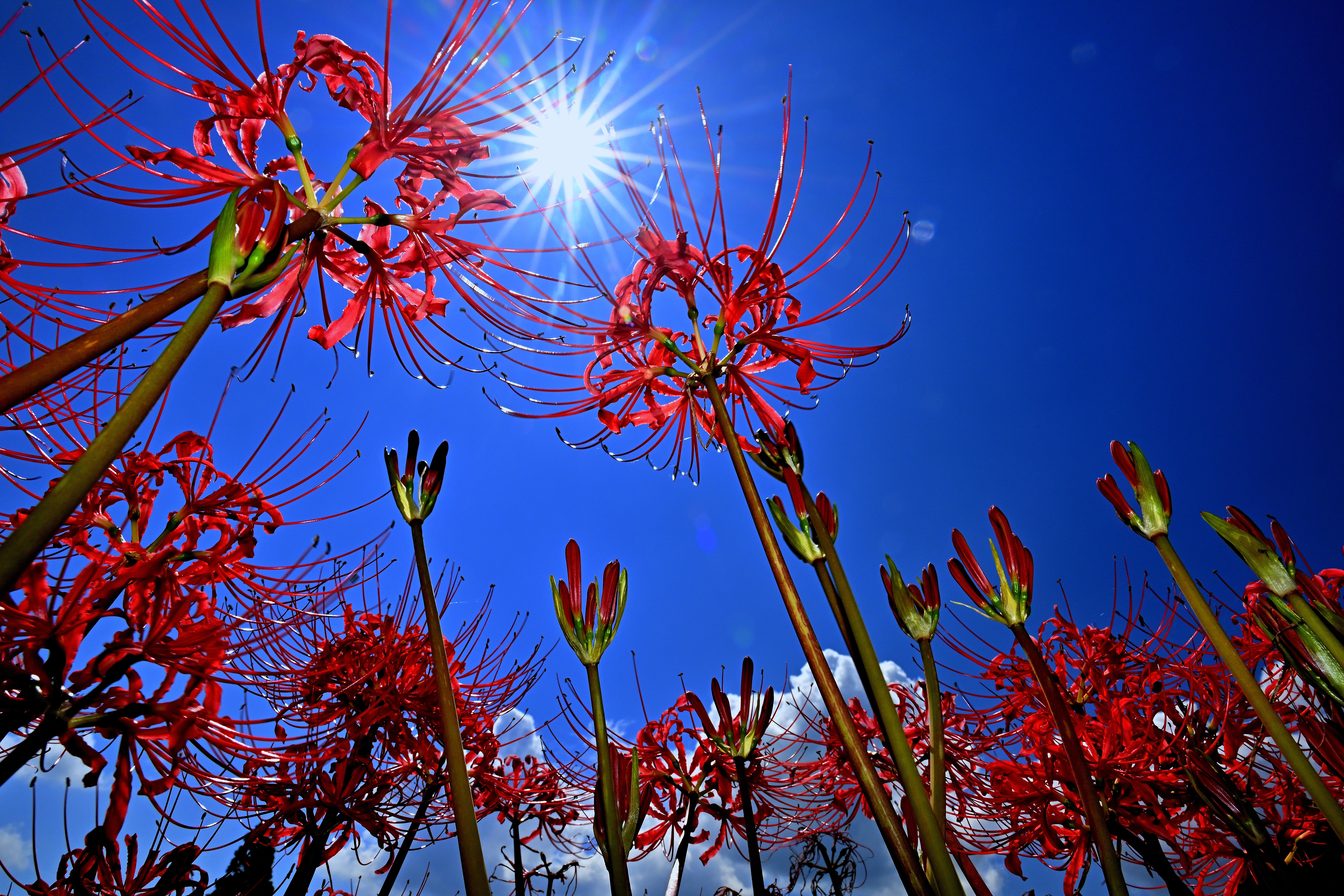 投稿を表示元気に太陽に向かって咲く彼岸花がとても美しいです。9枚円形絞りとレンズ性能の相乗効果だと思いますが、太陽の光条がとても綺麗ですね。^^