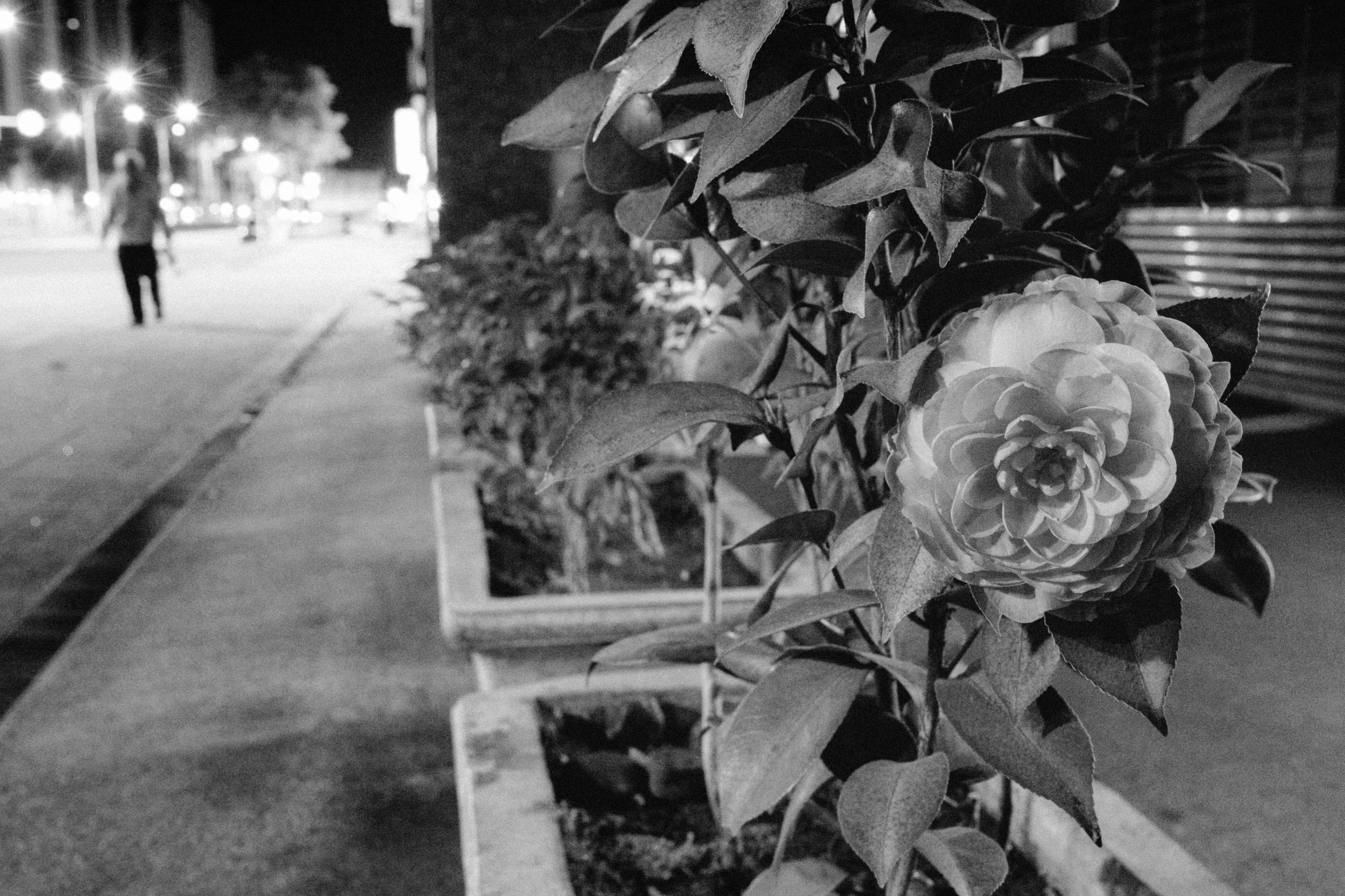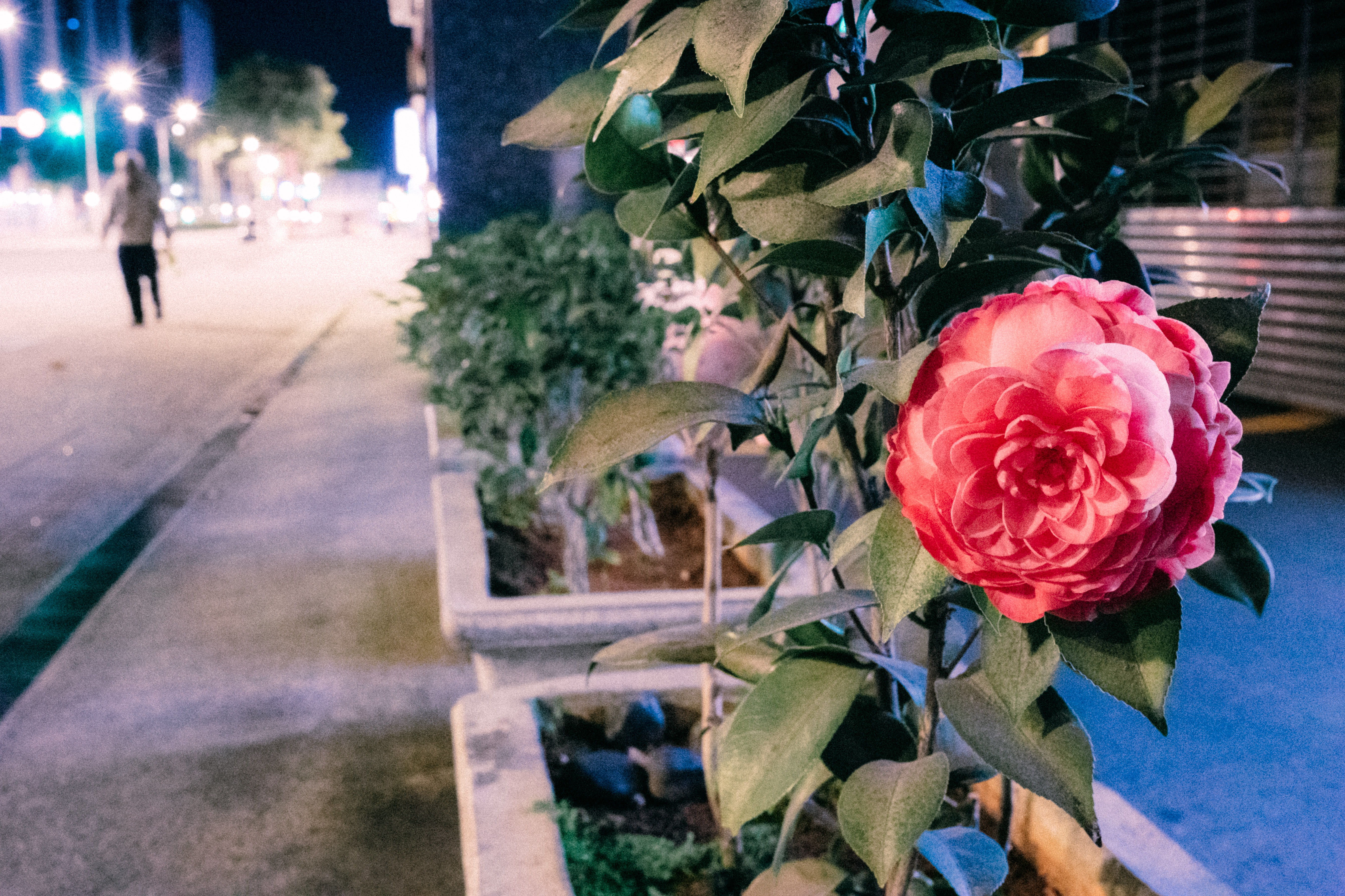 台北の中心部を南北に貫く大きな通り、夜の松江路にて、鉢植えに咲く花。