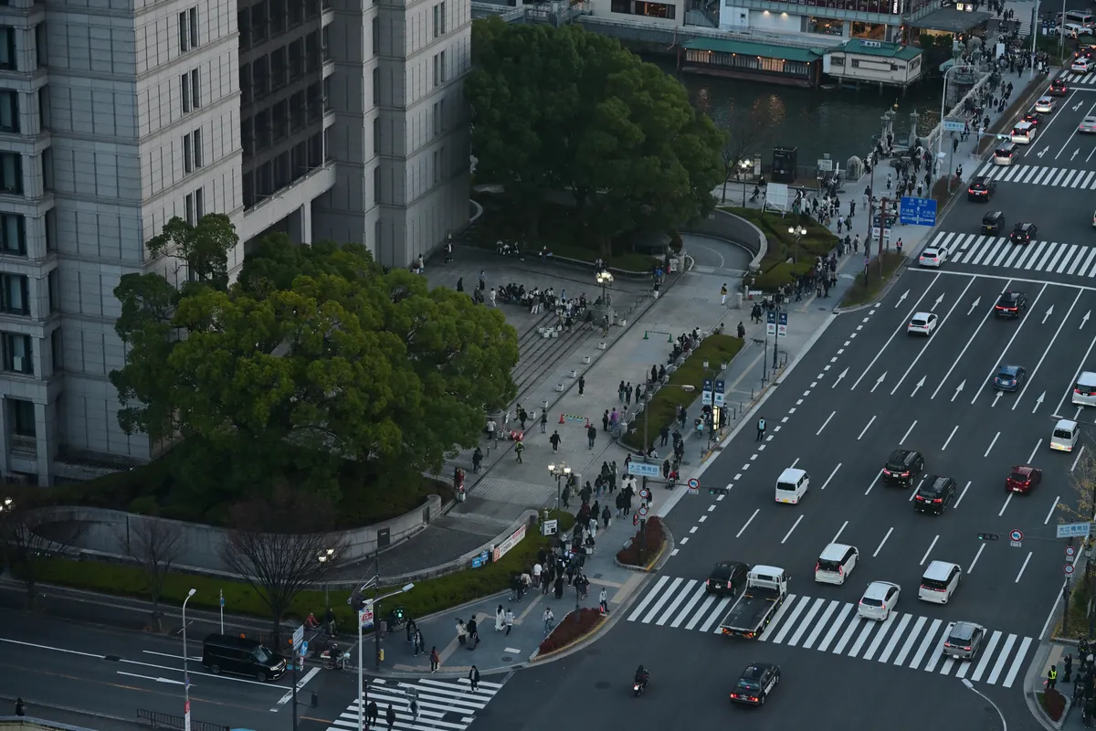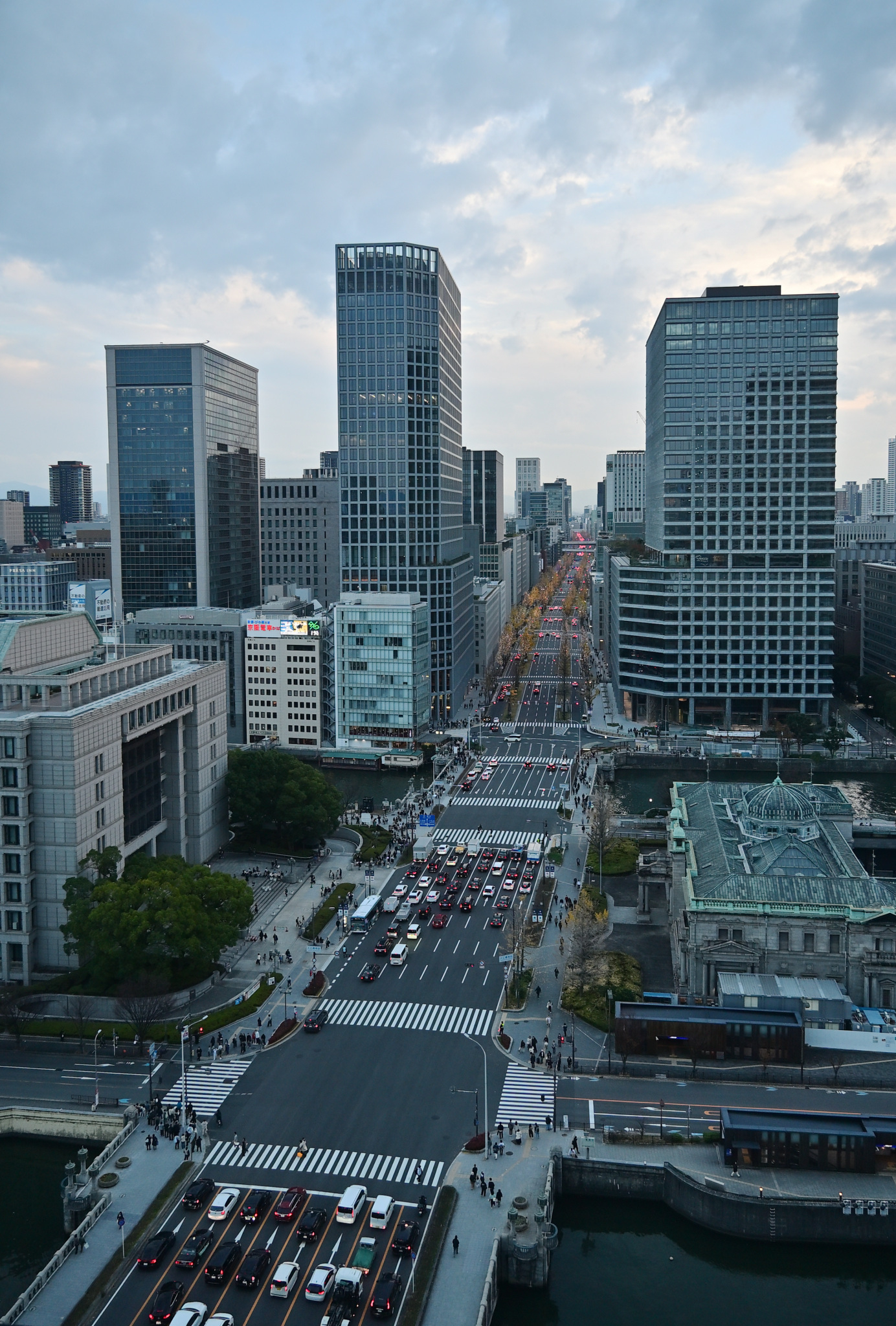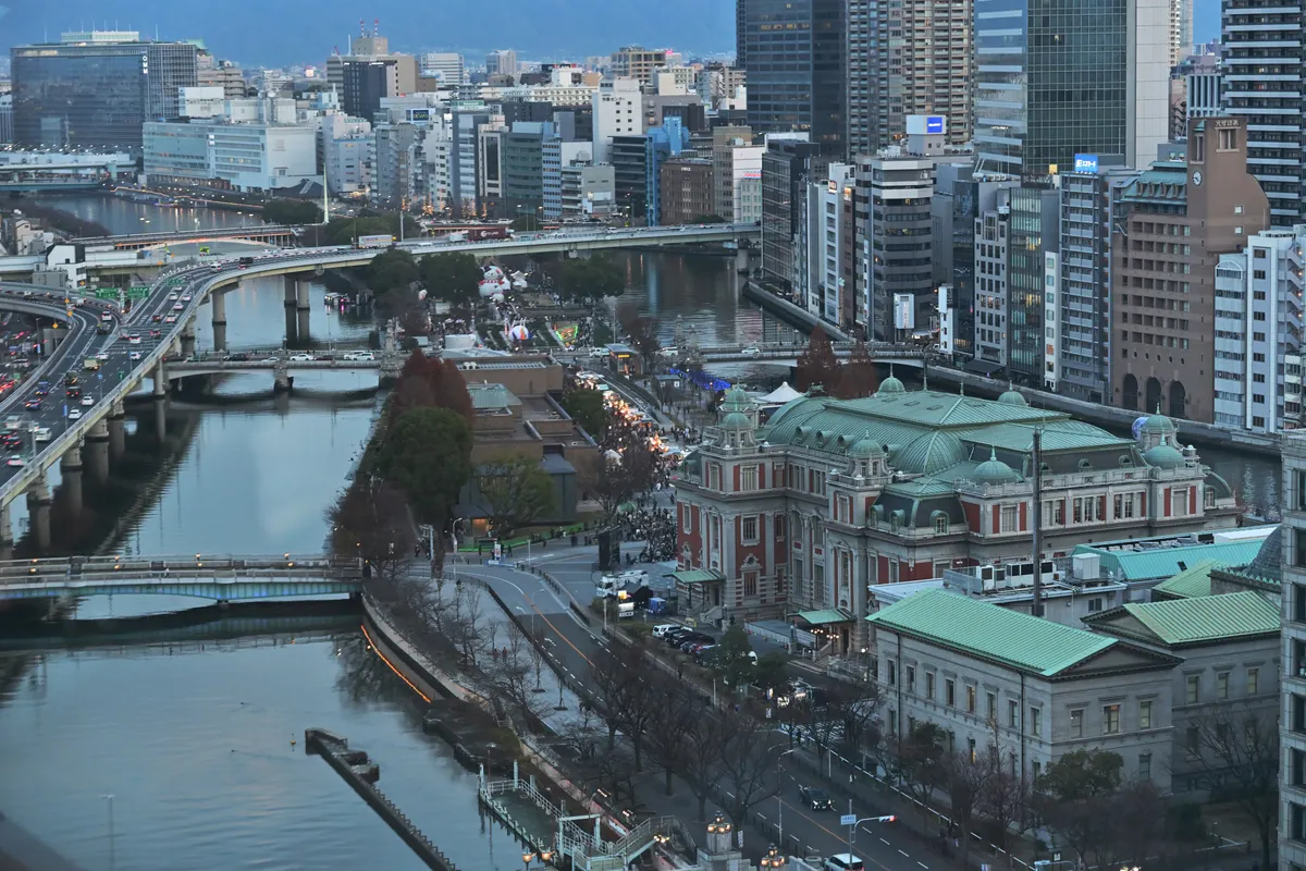 16階に着いたらすぐ窓際まで前進、見下ろすとすぐ左手に大阪市役所、