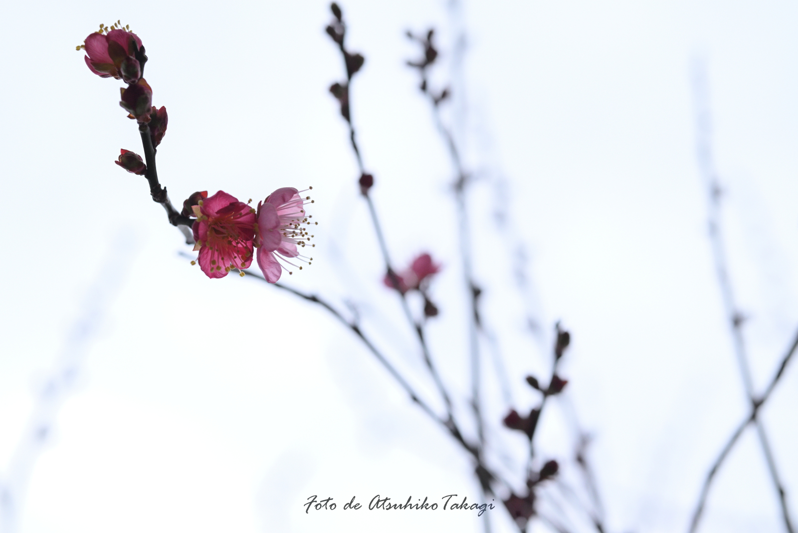 蕾を撮り終えたあと、声のした方へに行くと紅梅が咲き始めていました。