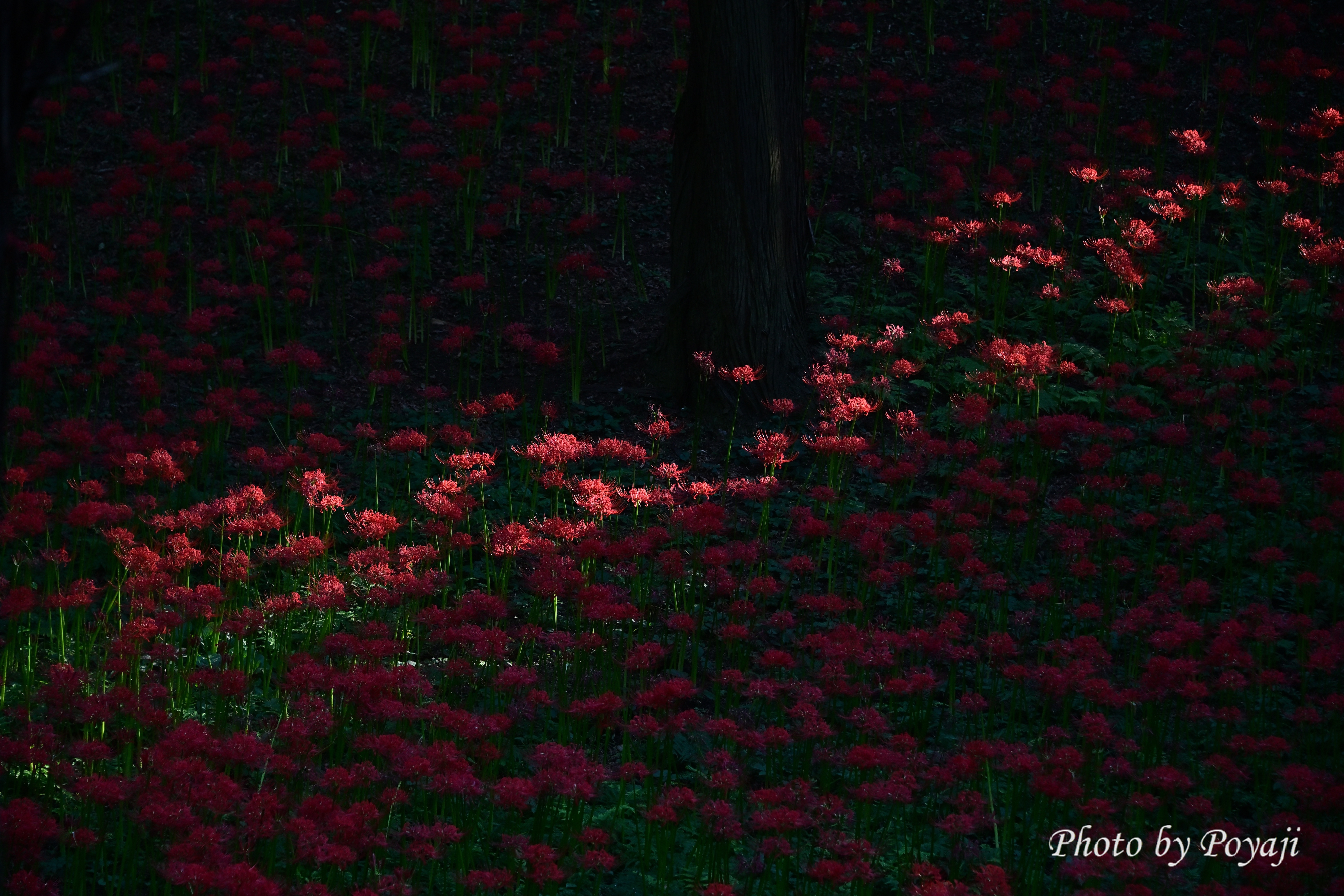 彼岸花の群生に陽が差した一瞬だと思うのですが、すごくユニークですね。