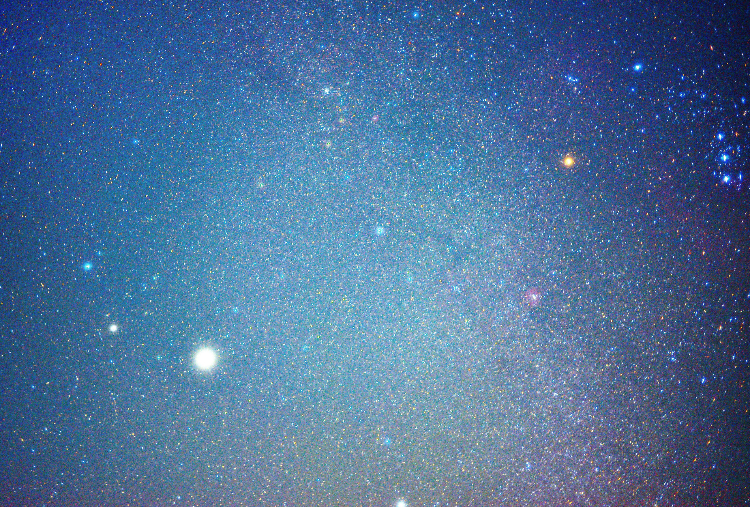 郷里の家の近所で撮影した双子座と銀河です。右上には、オリオン座です。オリオン座のベテルギウスの紹介は前回したので、今回は双子座のカストルとポルックスのお話をします。