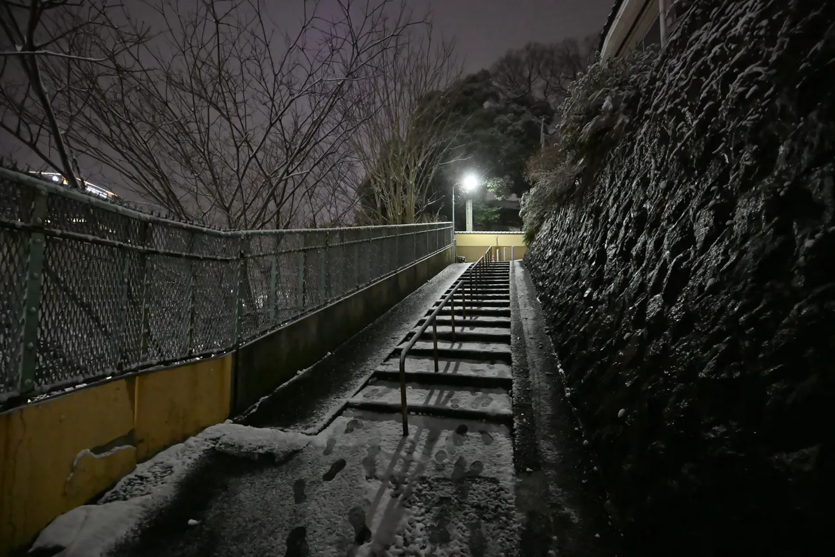 日暮里駅から谷中霊園につづく階段でうっすら積雪してます。