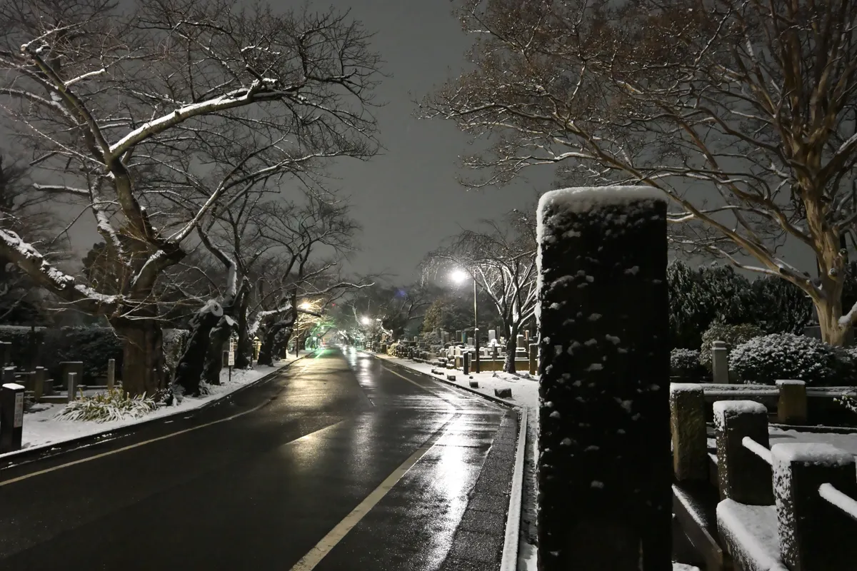 谷中霊園の桜並木です。道までは積雪してませんでした・・ちょっと残念😅