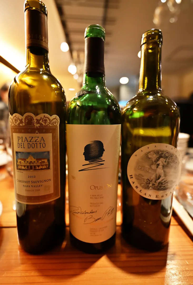 そして、こちらが回答となるカルトワイン+1です。真ん中がオーパスワンで、右隣がハーランエステート(年代物なので、エチケットが剥がれたので、即席で付けています)です。