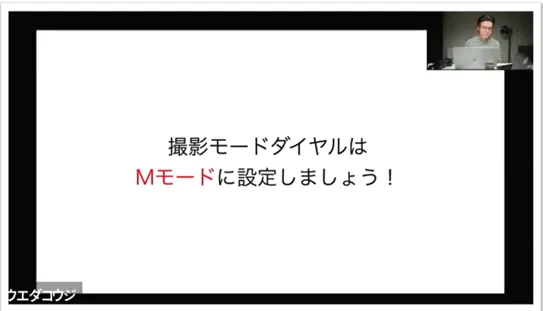 まずは、動画撮影時のモード設定についての説明がありました。動画の場合、明るさが変わると見づらくなってしまうため、基本的には「露出を固定」して撮影します。そのため、多くの場合はM(マニュアル)モードで撮影するのが一般的です。室内から屋外に移動するなど、明るさが大きく変わる場面ではオートを使うこともありますが、基本はMモードが中心となります。