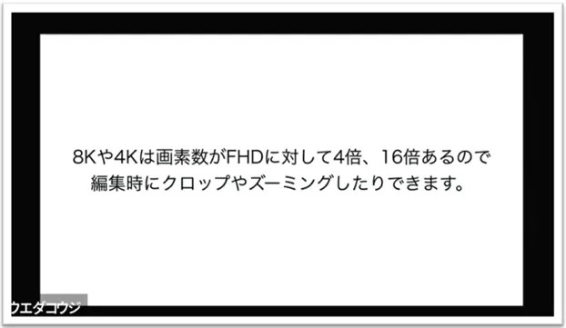 このように、高解像度で撮影しておくと、静止画でいう「トリミング」に近い編集が可能です。また、4KからFHDへゆっくりズームしていくなどの表現も、画質を保ちながら行なえます。