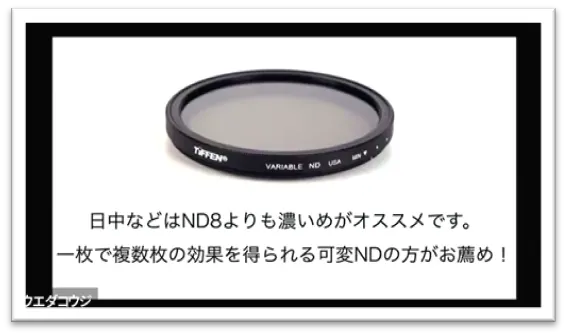 30fpsで撮影し、シャッタースピードを1/60に設定すると、日中は光が多すぎてしまう場合があります。その際は、光量を抑えるためにNDフィルターを使います。特に便利なのは「可変ND(バリアブルND)」です。固定NDの場合は、ND8やND16を1枚持っておくと役立ちます。ただし、可変NDには注意が必要です。可変NDはPLフィルターが2枚重なってできており、角度を変えることで光の量を調整します。そのため、例えば海の撮影では、回すたびに反射が消えたり出たりし、映像の中で反射が一定しない問題が起きてしまいます。とても便利な道具ですが、反射の変化には気をつける必要があります。