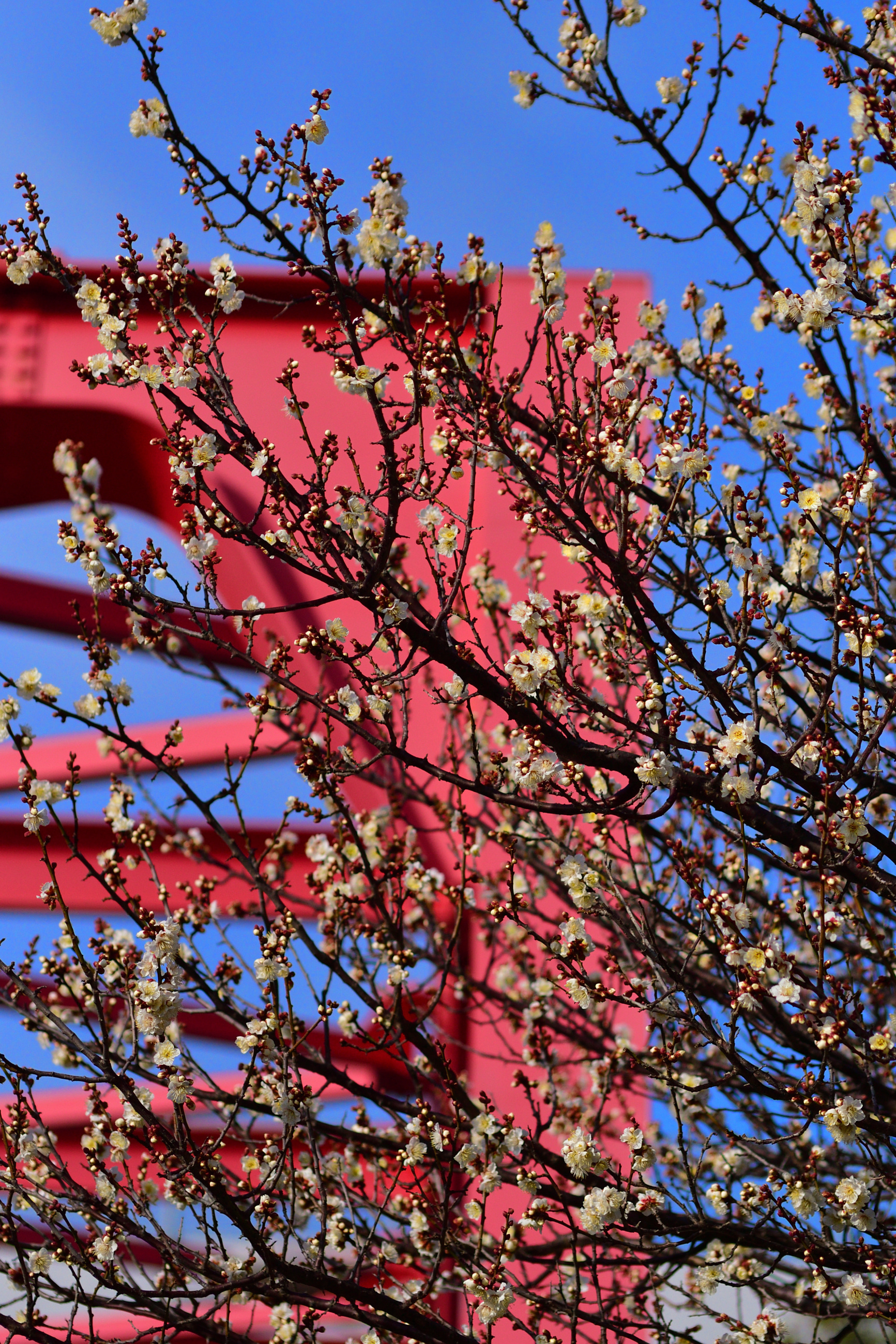 投稿を表示もうこんなに梅が開花しているんですね、青い空と赤い橋と白梅のコントラストがとてもいいです。