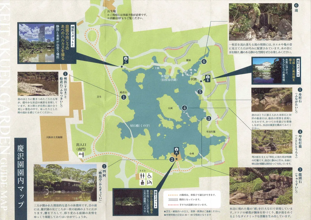まずは、慶沢園の入園時もらったガイドに書いてあったフォトスポットについて説明します(下画像参照)。