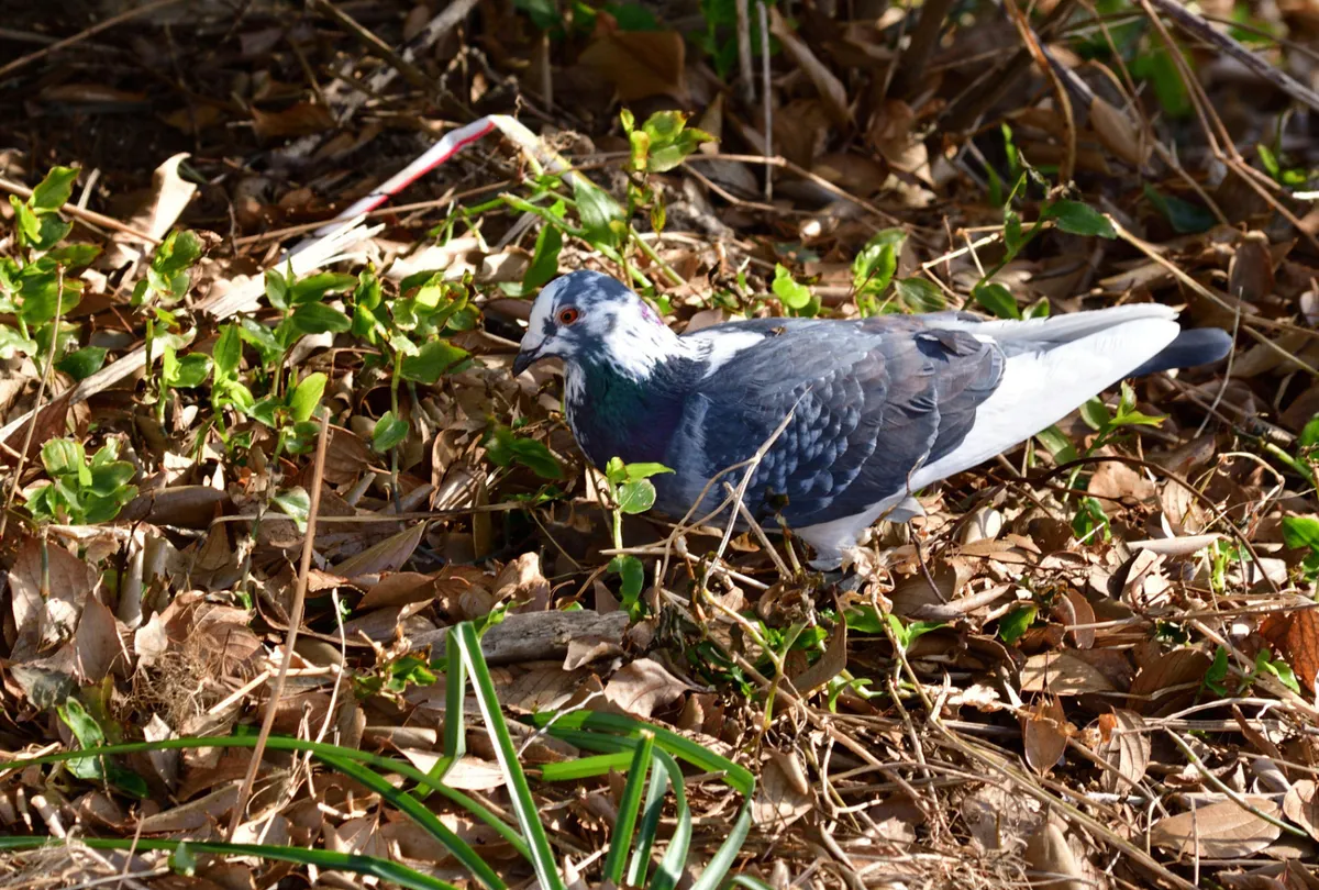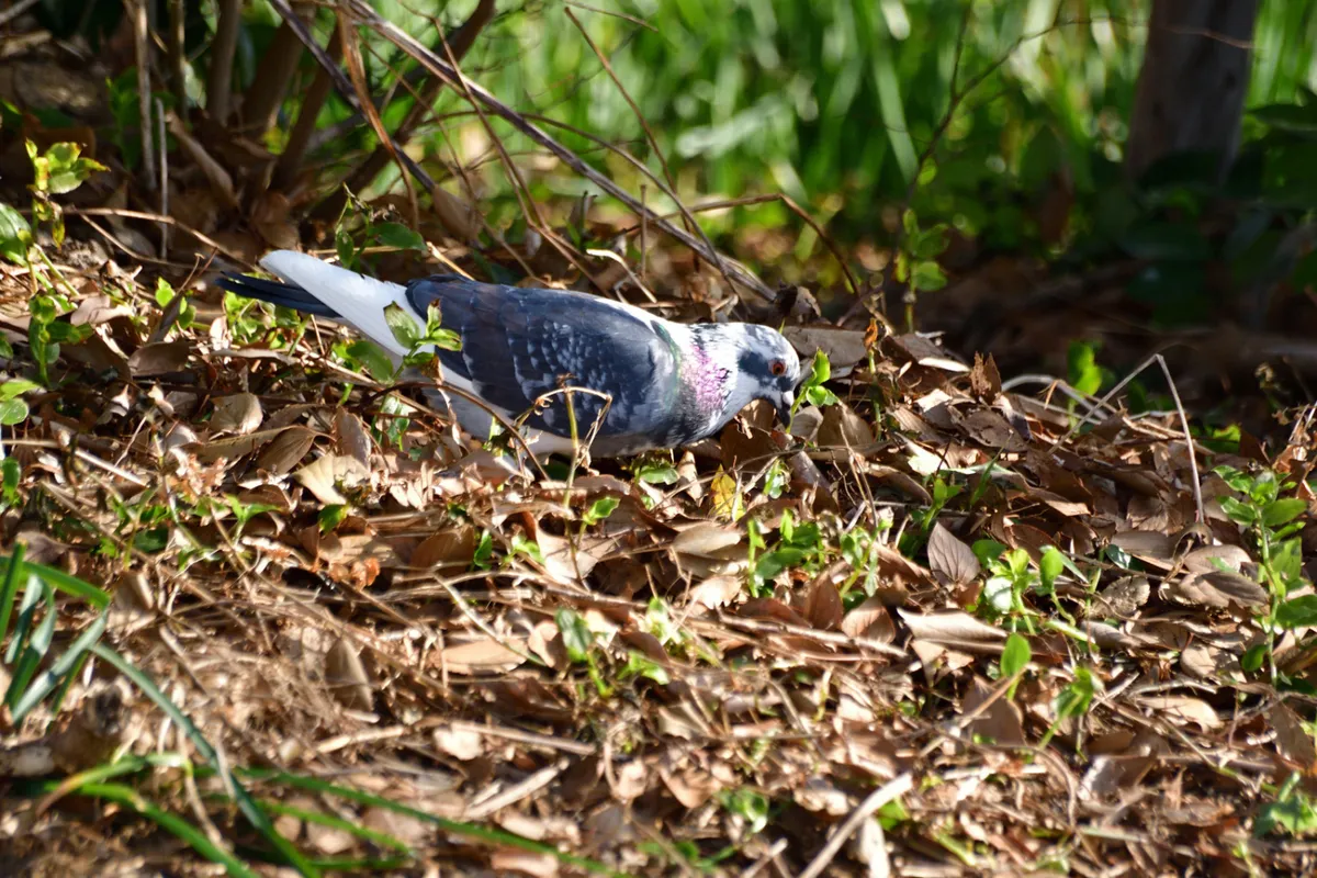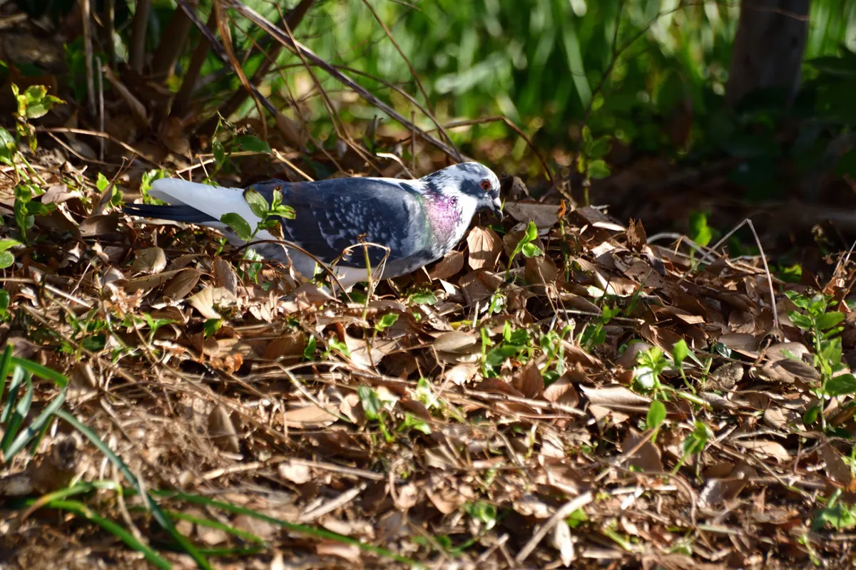 以前から茅ヶ崎の鶴嶺神社にブチの鳩を見かけていましたが、鶴嶺神社に近い小出川を散歩中にこの鳩が地面をつついてお食事中だったので撮影しました。近づいてもあまり逃げないのは、やはり神社で人は無害と知っているせいだと思います。^^