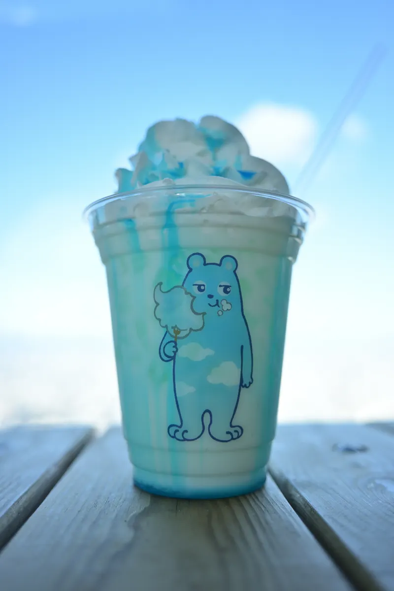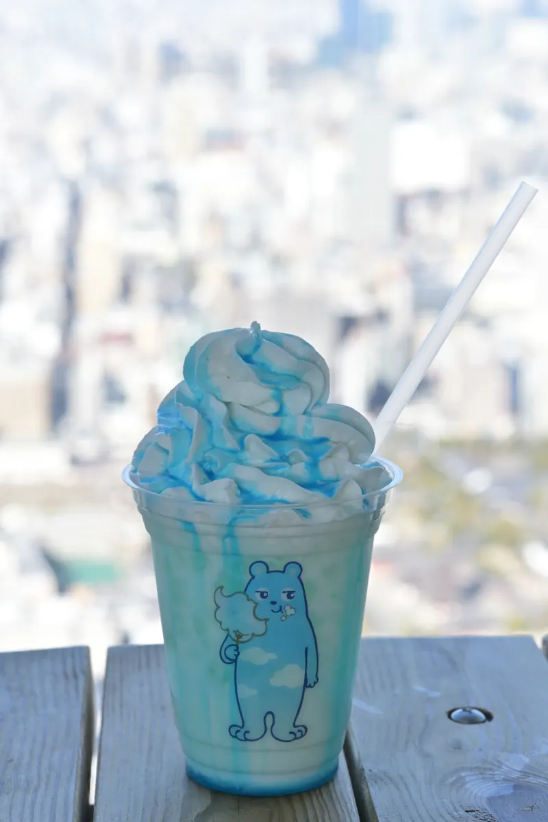 オープンスペース(空中庭園)の横に在るカフェ「SKY GARDEN 300」で注文したのは、あべのべあのマークが付いてた「スカイブルーラテ」です。せっかくなので、記念写真をパチリ。