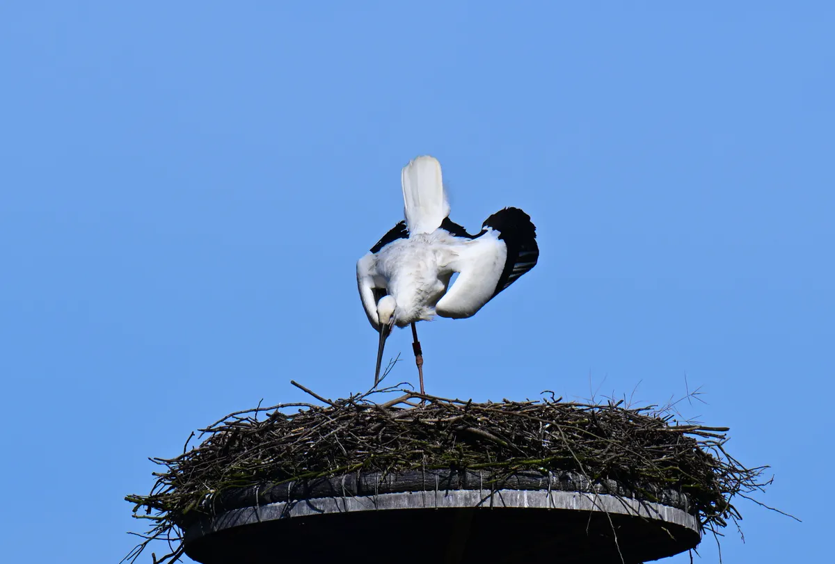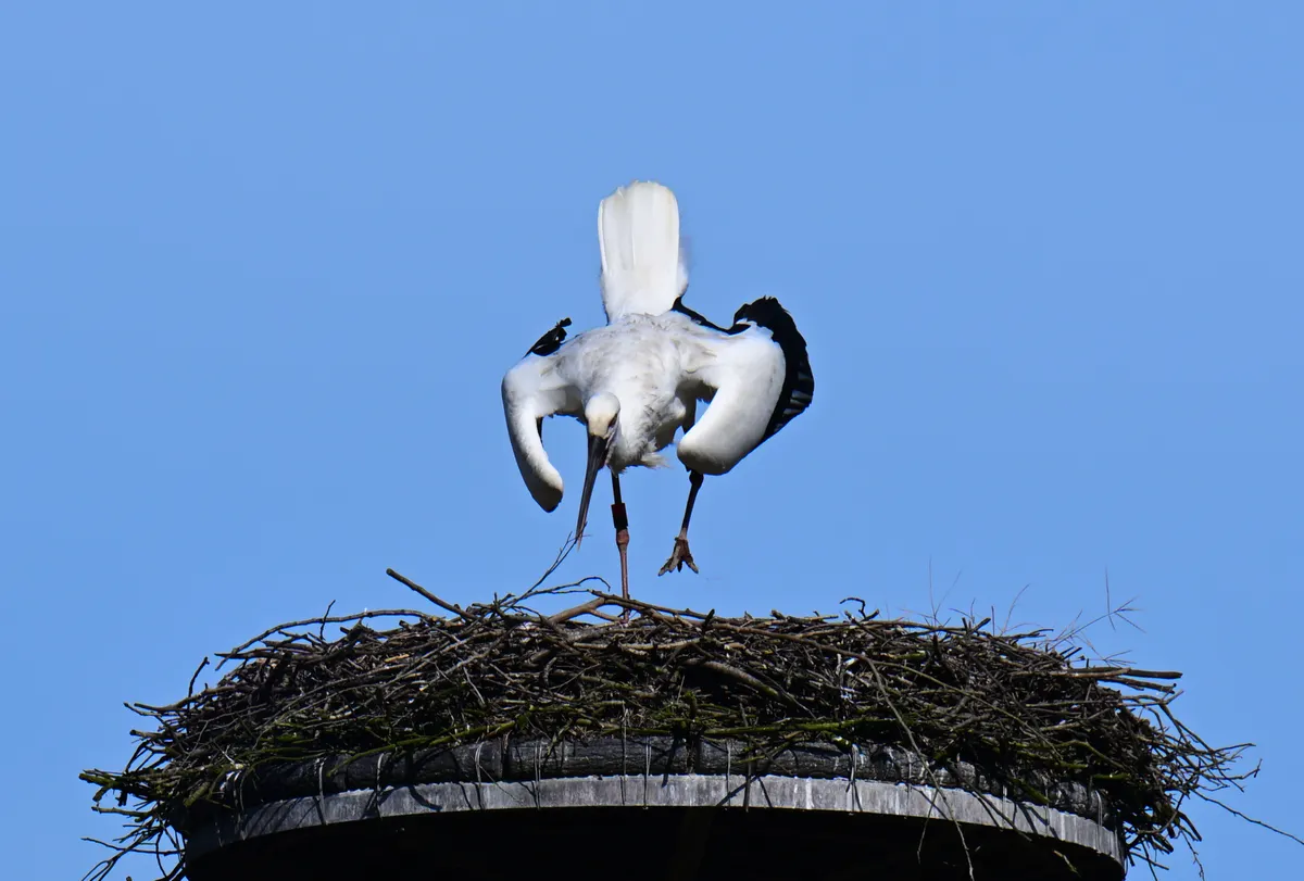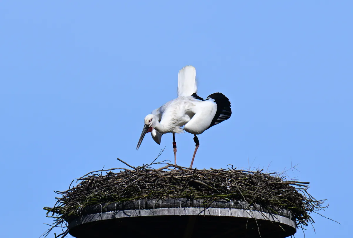 兵庫県の豊岡市の「コウノトリの郷公園」の人工巣塔にコウノトリが帰巣してきた際に撮影しました。公園に行った時には居なかったのですが、公園内を廻っている際に戻ってきたと聞いて撮れた写真です。