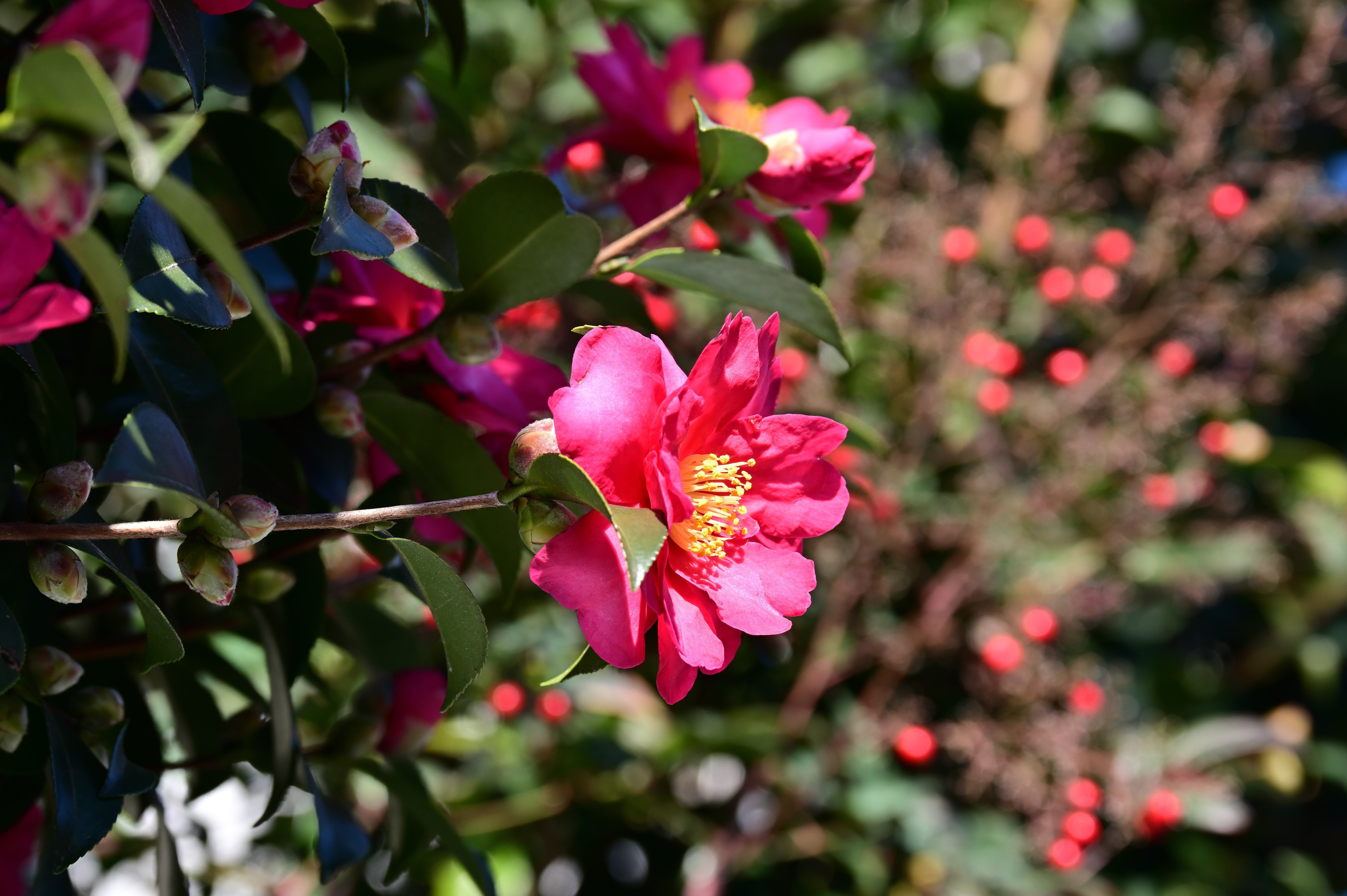 冬色チャレンジ 山茶花咲く 庭の紅梅の蕾