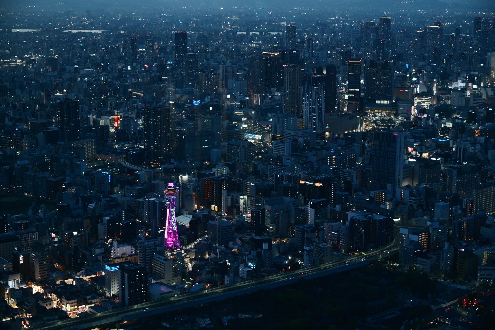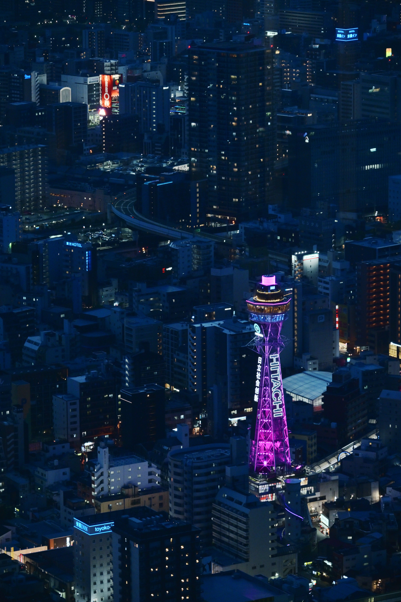 こちらは、通天閣にズームしたところです。通天閣の少し左上の辺りに阪神高速が走っているのが見えますね。