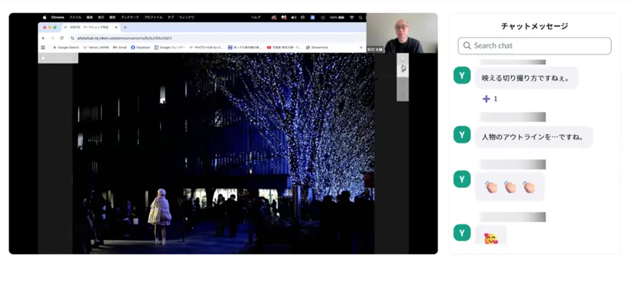 このワークショップ作品講評では、反射、シルエット、ボケ味などのテクニックを活用した作品が多く見られ、人物とイルミネーションの組み合わせ方や構図のバランス、人が多い場所での撮影で、余計な人を入れずに撮ることのむずかしさを感じた方も多かったようです。