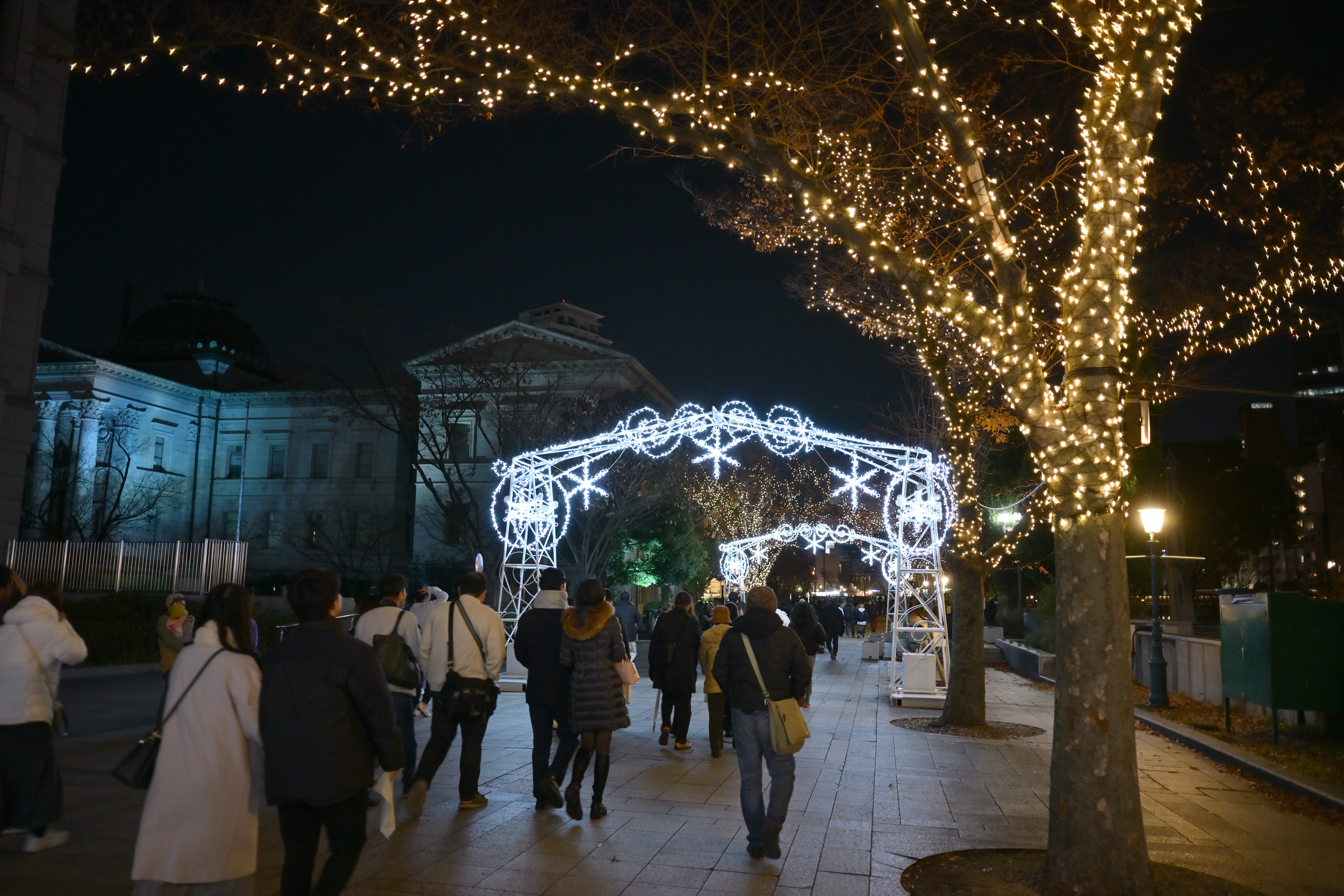 タイトルにも書いてある通り、いま大阪市役所から中之島公園までイルミネーションで覆われています。中央公会堂に着いた時、イベントをやってて、ちらっと上戸彩さんを見ることができました。ラッキー!