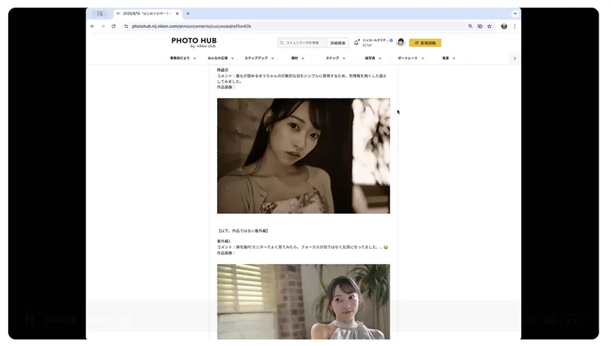 そして、「自分の癖を知るためにも、過去参加した撮影会や作品を見直すことも有効ですよ~。がんばってね。』とお話いただき、セレクトの大切さと共に、毎回オンライン講評のあとに改めて作品を見直し、再度投稿してほしいとお話いただきました。