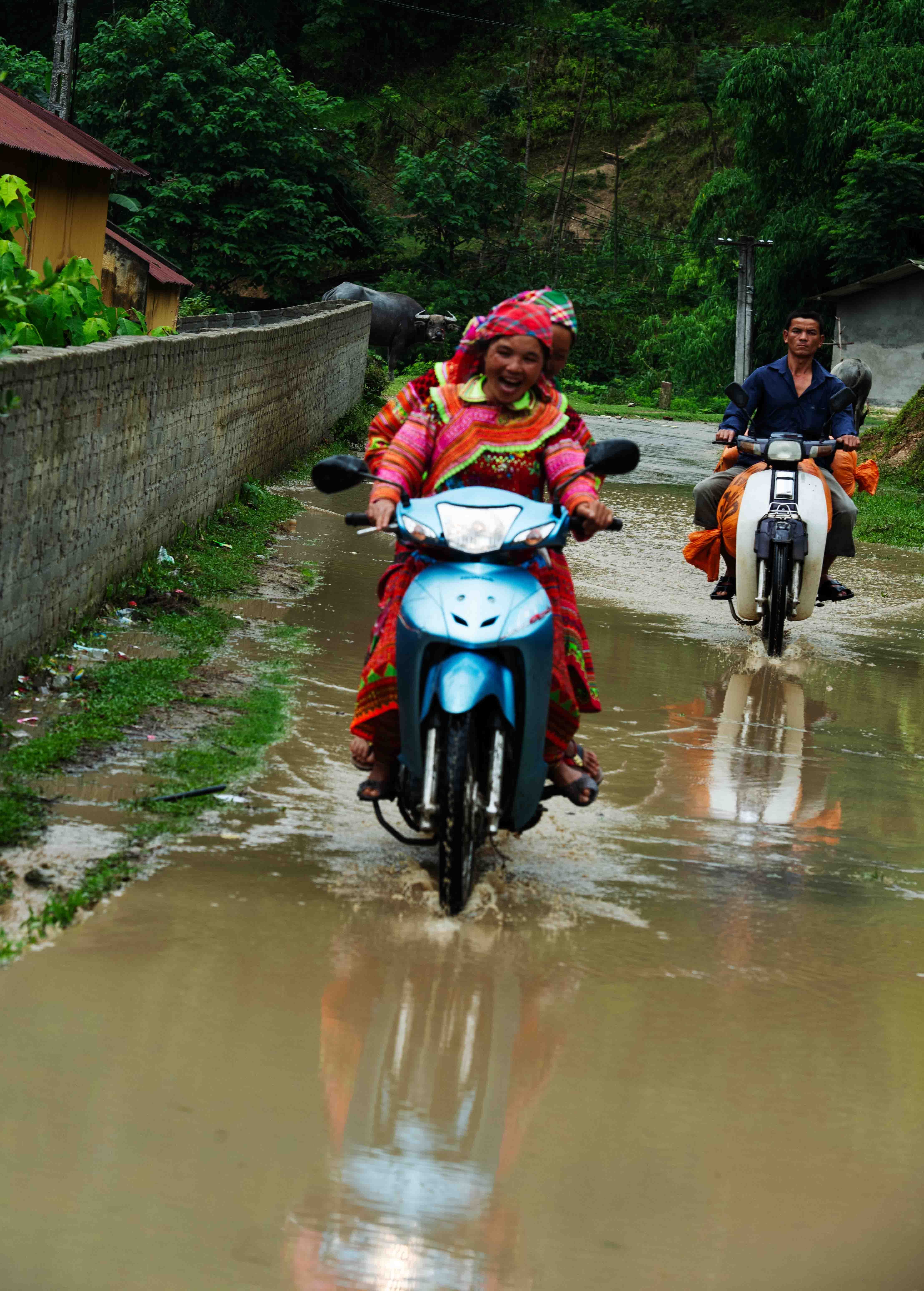 投稿を表示雨が降ろうが、道がぬかろぼうが平気。モトクロスのテクニックが自然に身についているようですね。また女性の服装がカラフルで素敵です。