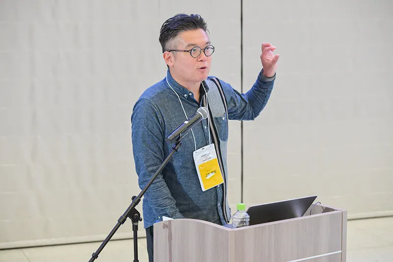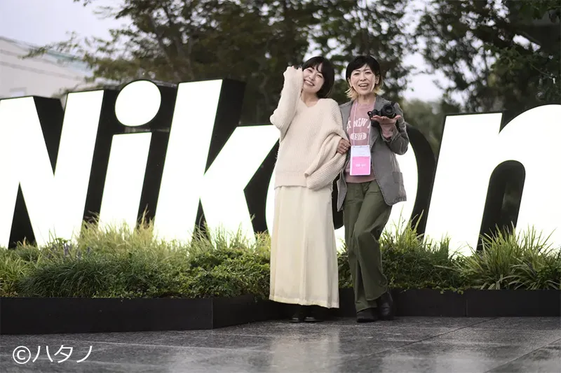 オープニングセレモニーに始まり、まず最初に「Nikon開発者トーク」でアトリウムに登場したのは光学本部 第三設計部 第一光学課の原田壮基(はらだ ひろき)さんと、同じく第二光学課の大竹史哲(おおたけ ふみあき)さんです。大型サイネージに画像を投影しながら、レンズ開発者になるまでのいきさつ、製品開発にかける思い、好きなレンズなど、たっぷりとお話をしていただきました。
