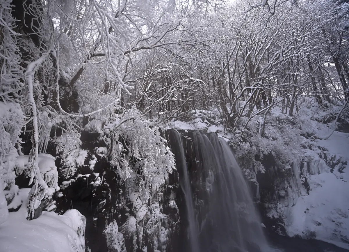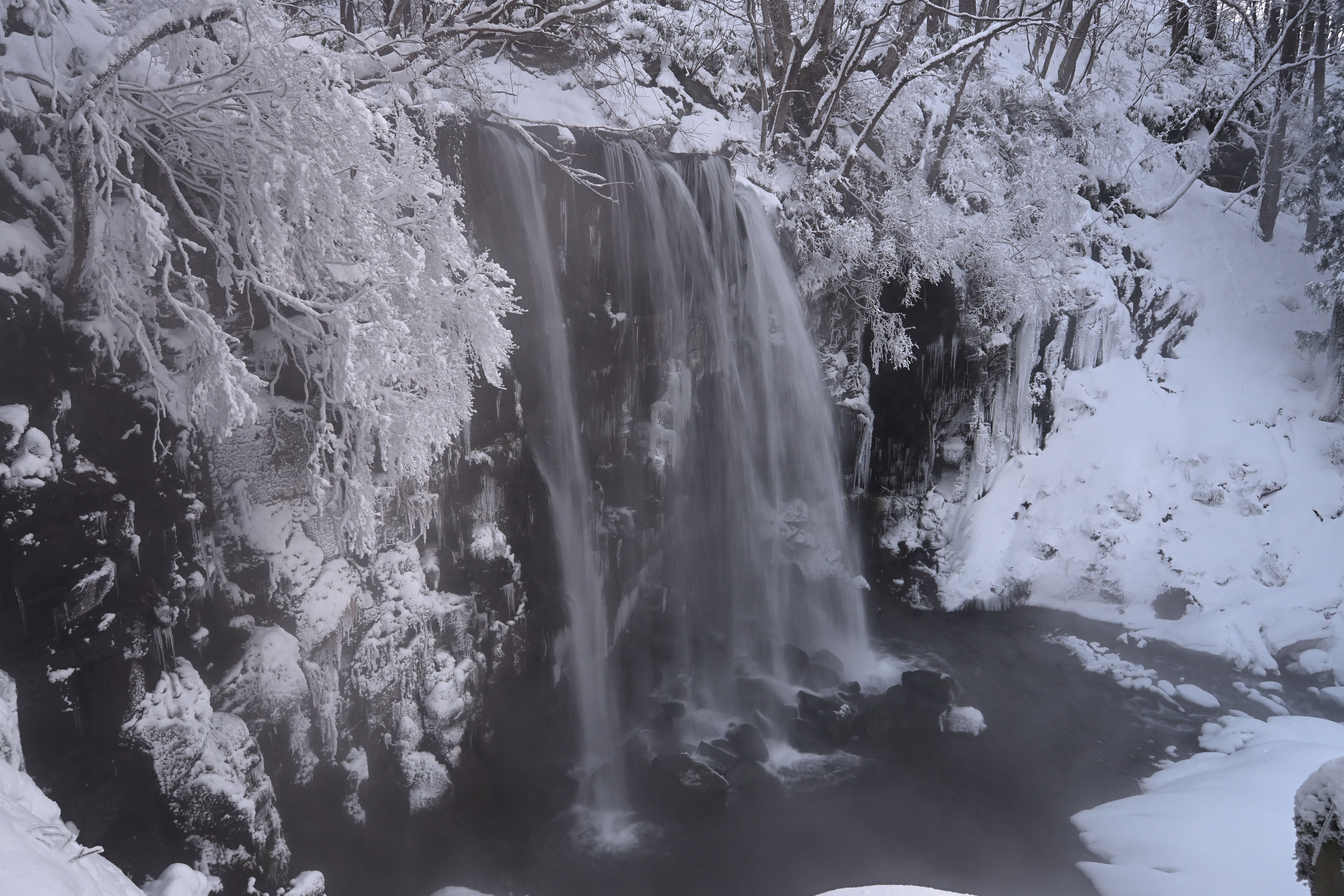 雪が積もり白い世界になった美しい滝を拝めました♪