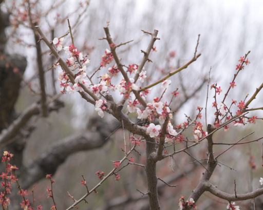 満開 赤色の花が盛り、白や混淆色の花が盛り過ぎ、寄らなければきれい |