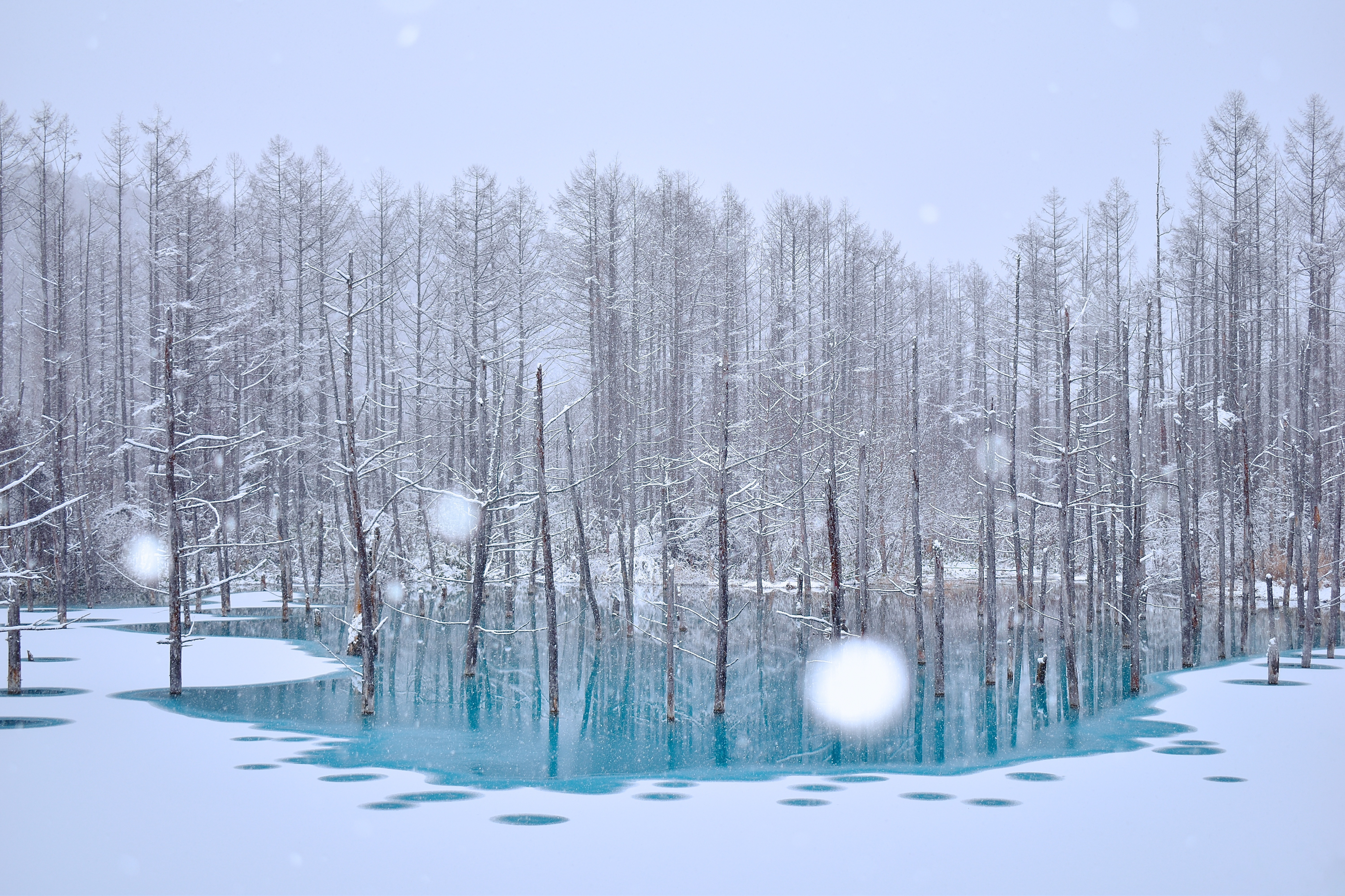 投稿を表示青い池に大きな雪の玉ボケが降って、幻想的で素敵です✨🎉🌟