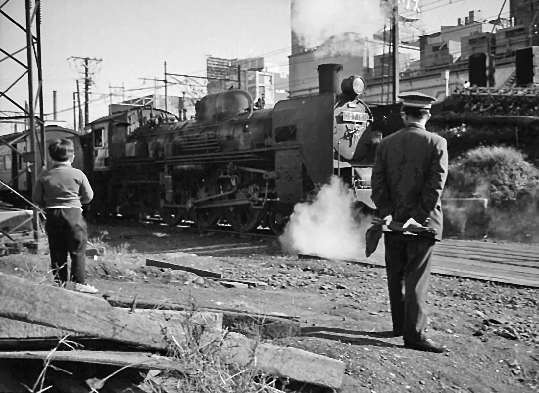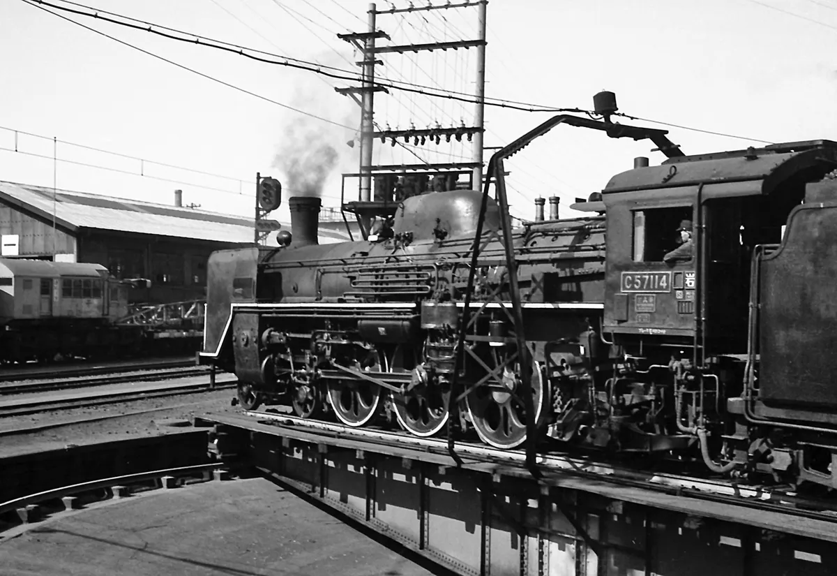 4枚目は、錦糸町駅のロッテシティホテルの辺りにあった踏切で入れ替えを行うC57。電車線は高架でしたが、客貨車区は現在の快速線の位置の地上にありました。