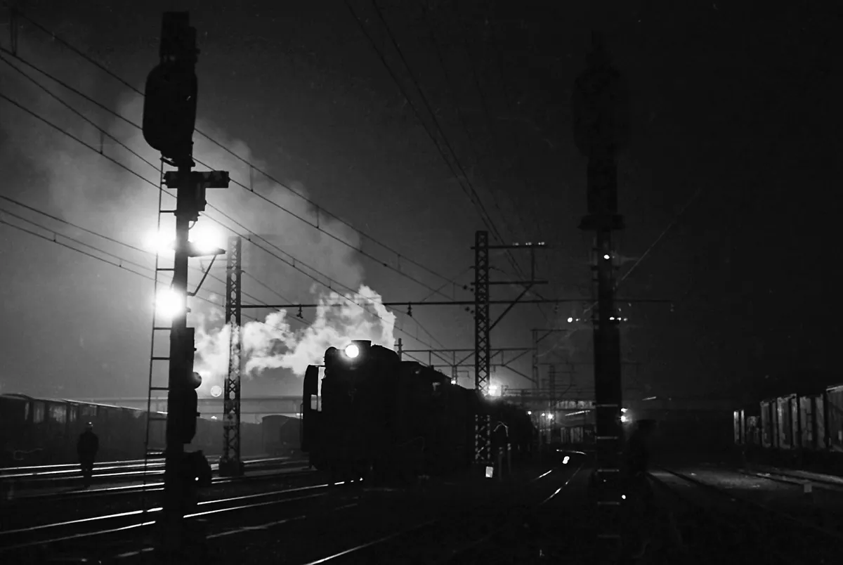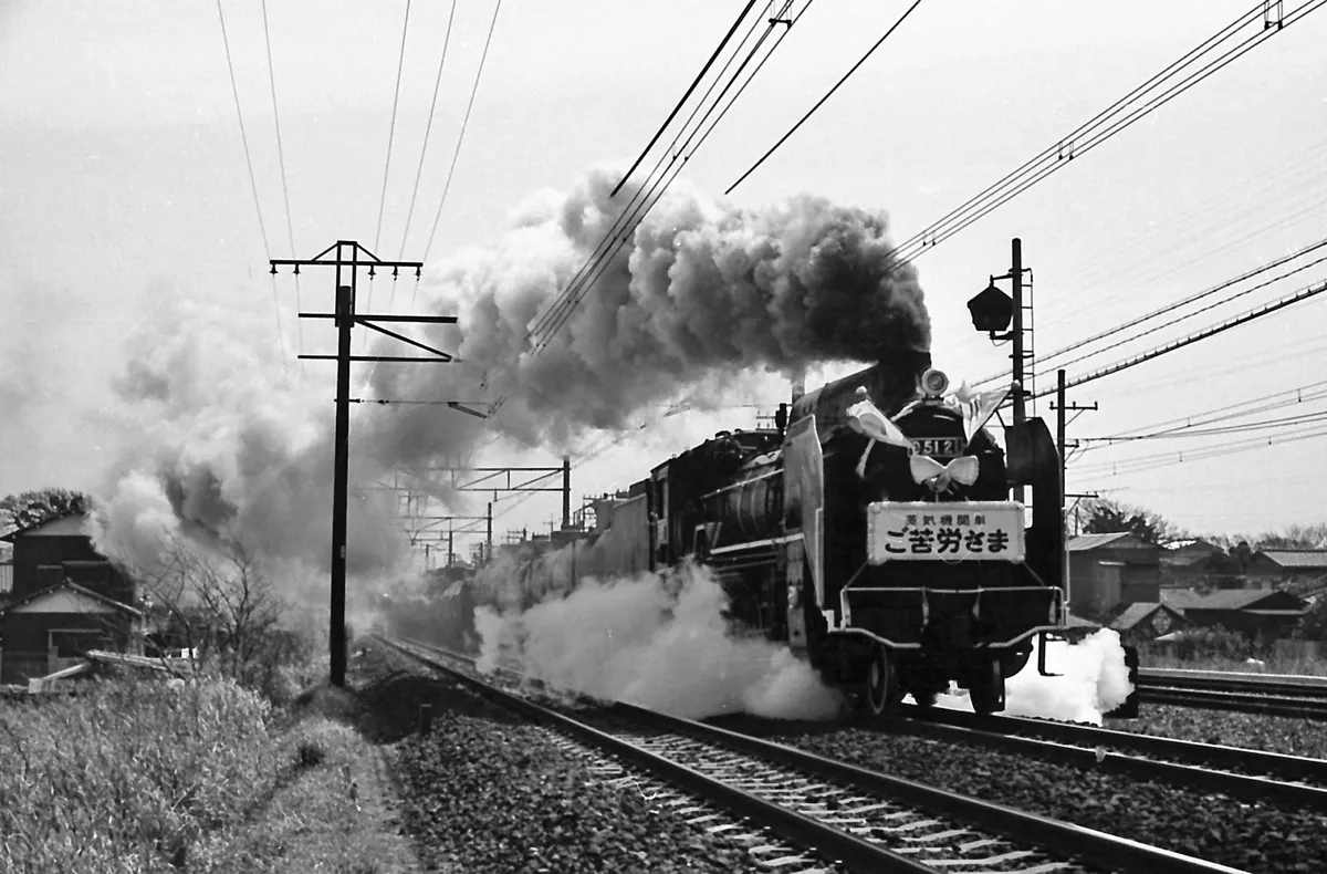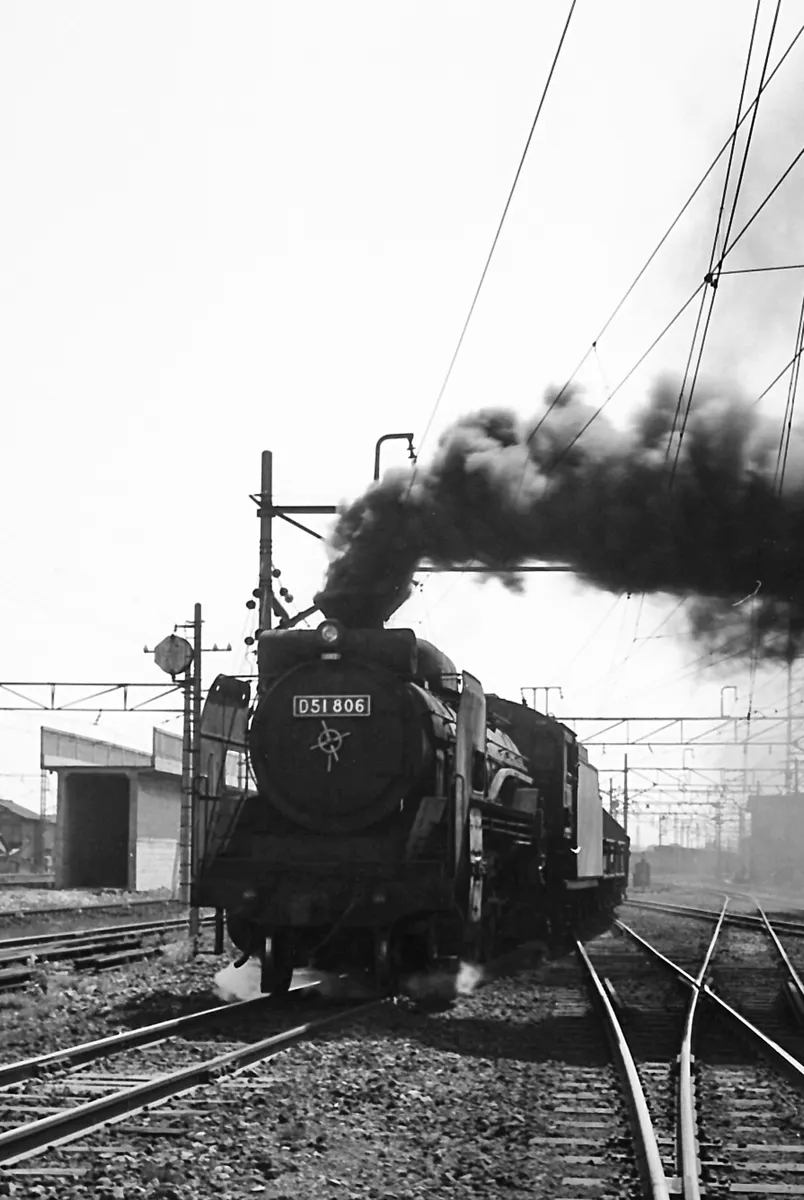 10枚目は新小岩貨物操車場から、千葉方面への発車を待つD51貨物。操車場には巨大な鉄塔の照明設備があり、夜汽車の撮影心をくすぐった。