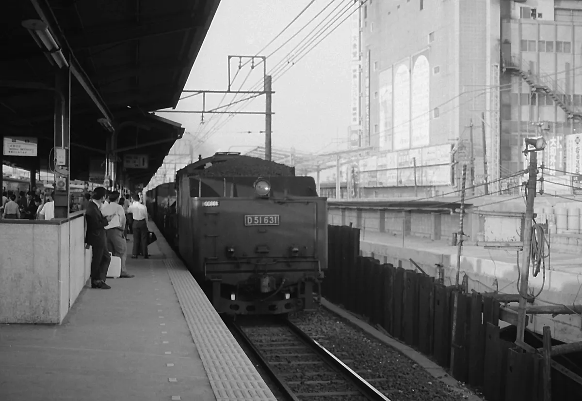 6枚目は総武線の新小岩駅上り線ホームを亀戸経由で越中島貨物線に向けて、逆向きで走るD51貨物。