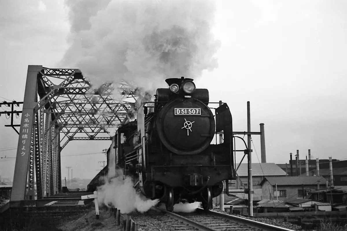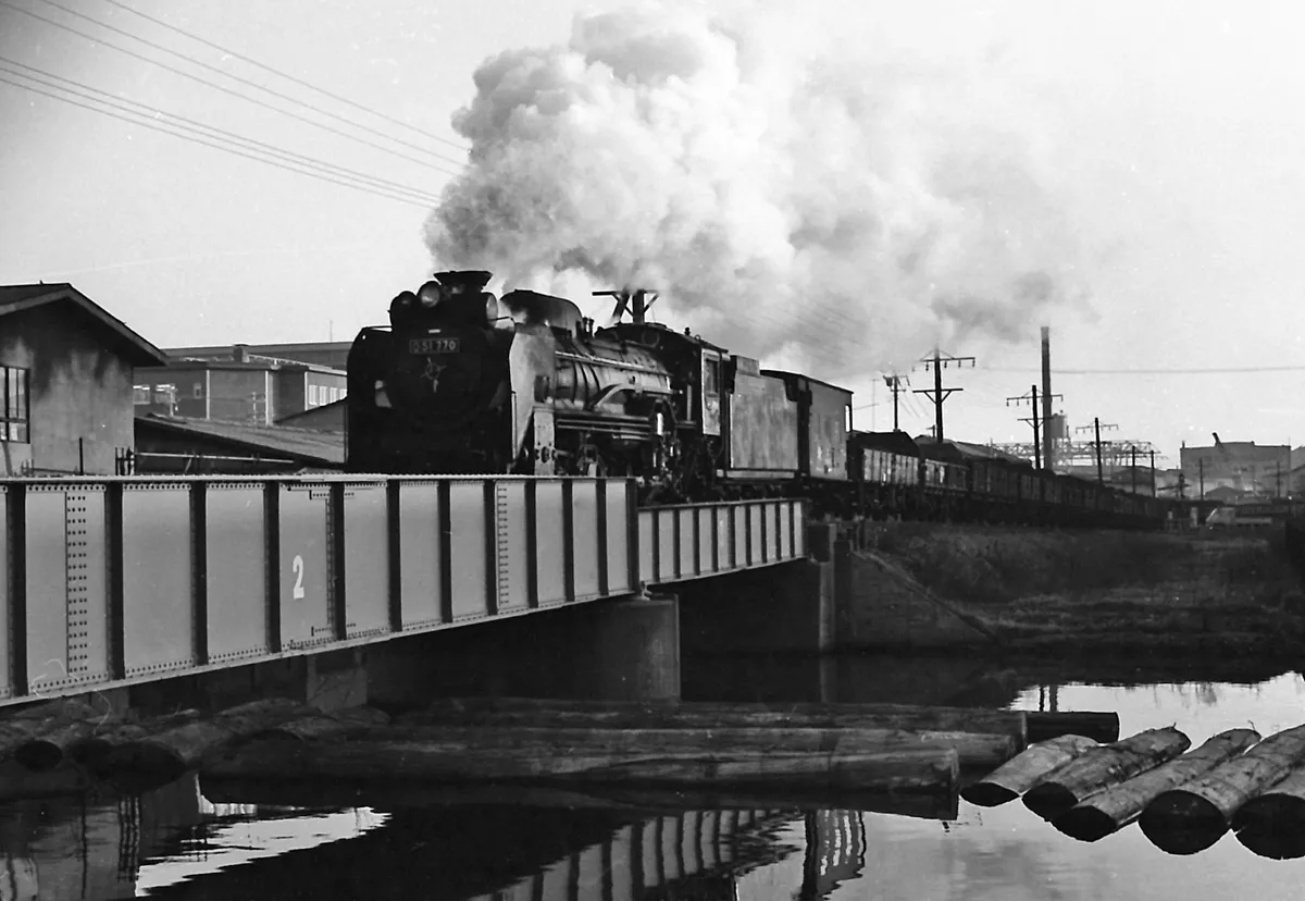 7枚目は亀戸駅から分岐して越中島貨物線の小名木川貨物駅(現在のアリオ北砂)の脇を走るD51貨物。