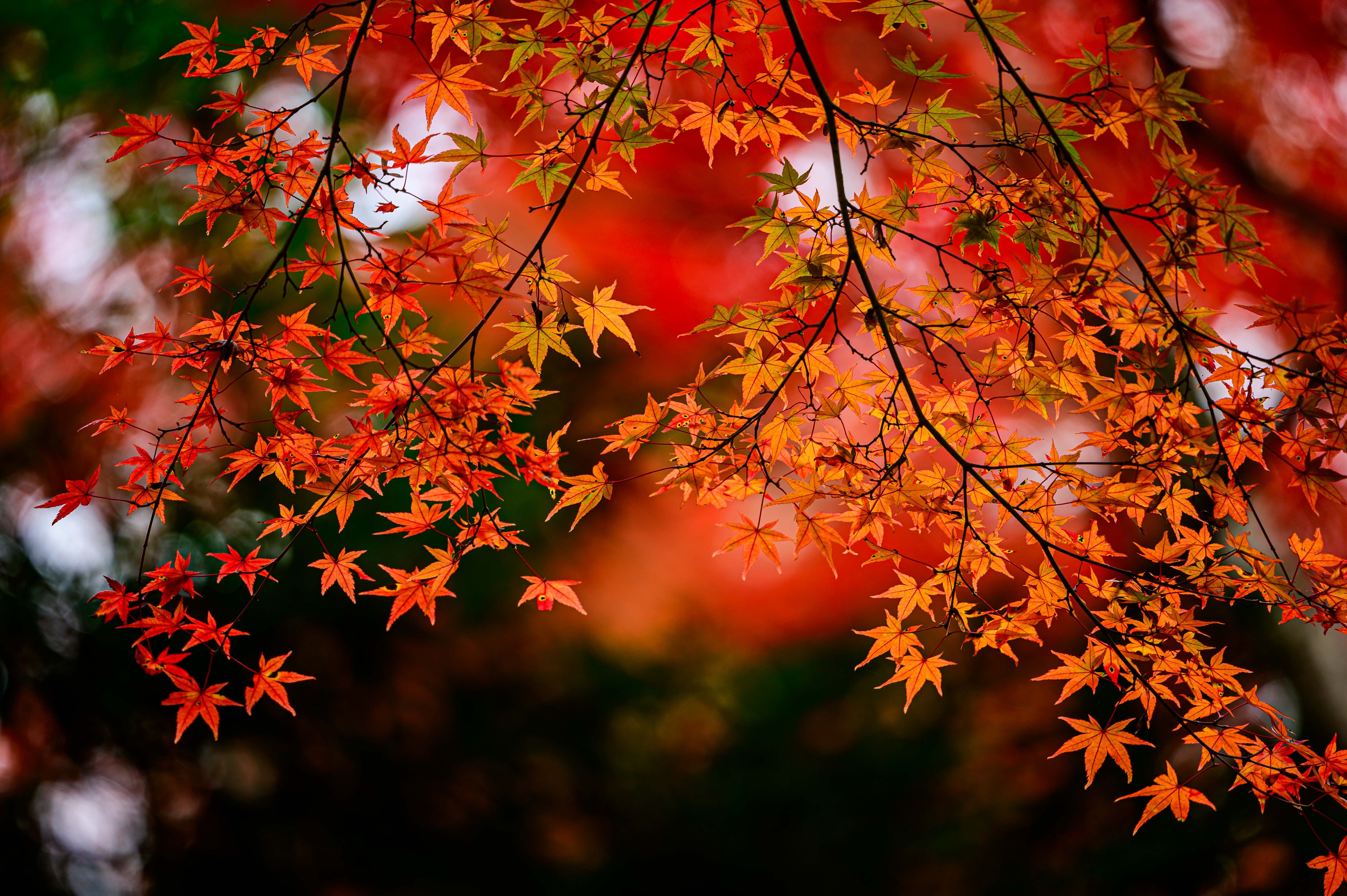 投稿を表示1本の枝に赤い葉、黄色の葉、緑の葉が付いていて