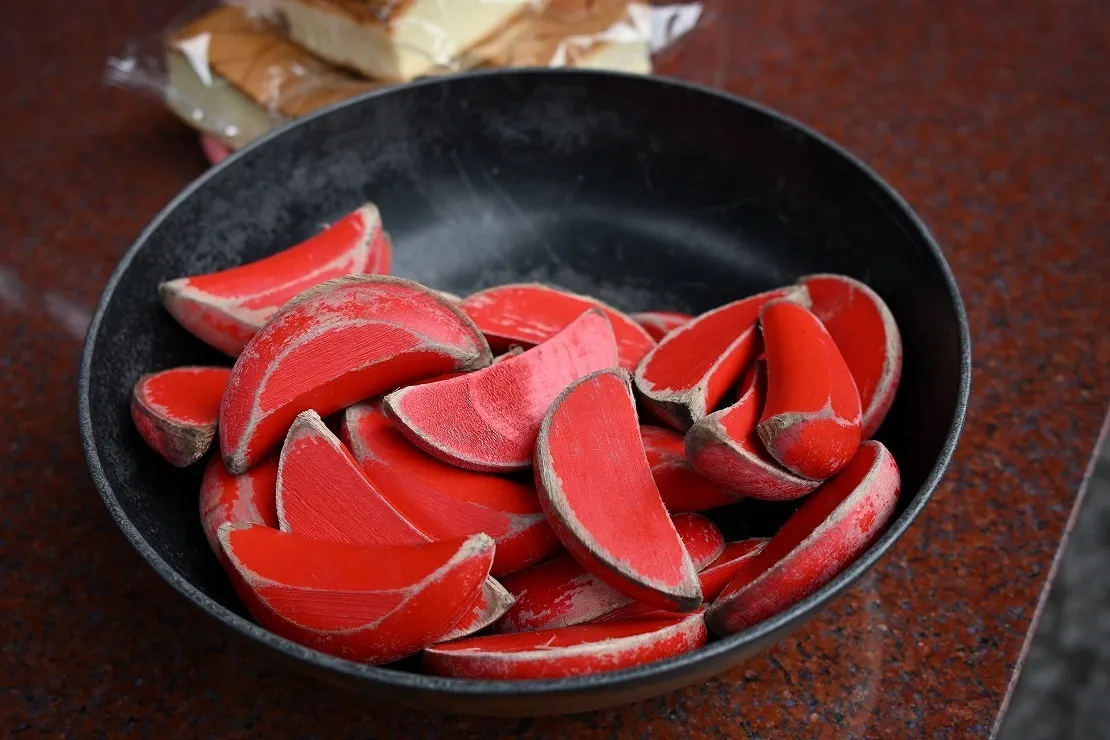 下から二枚目のみかんの房みたいな形の赤い木は、これを投げてどちら向きに落ちるかで占いをするんだそうです。