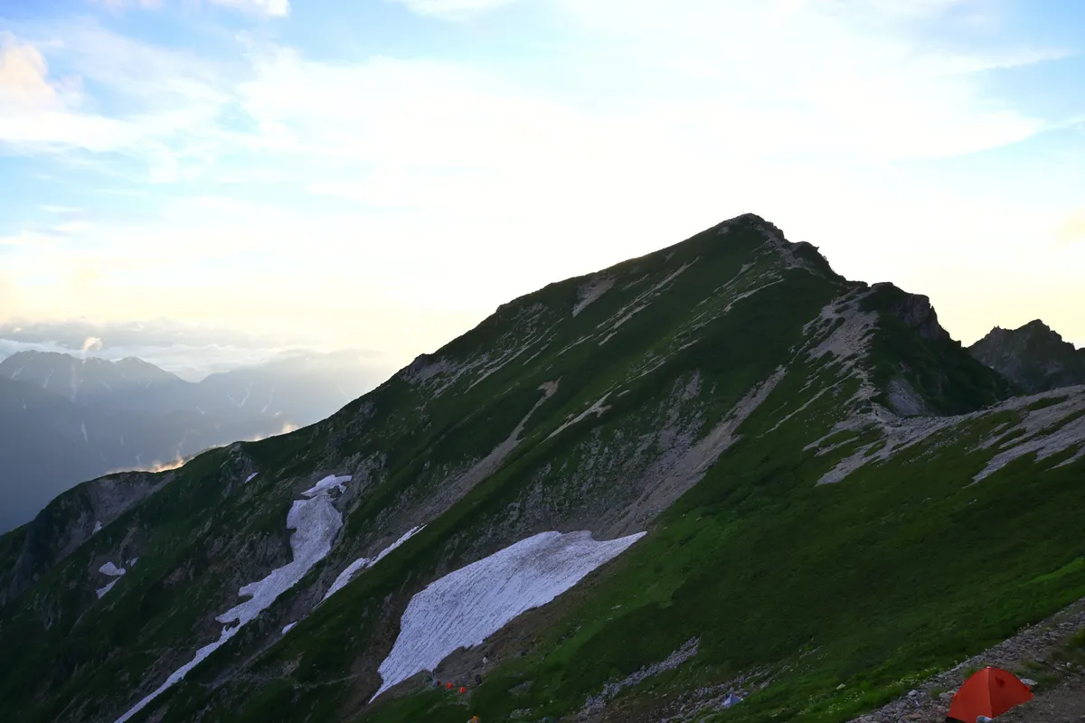 そして、右手に見えるのが唐松岳です。この後、皆で登ってきました。右手下にテントが写ってますが、テント泊する登山者の方も居ました(我々は山小屋に泊まりましたけどね)。