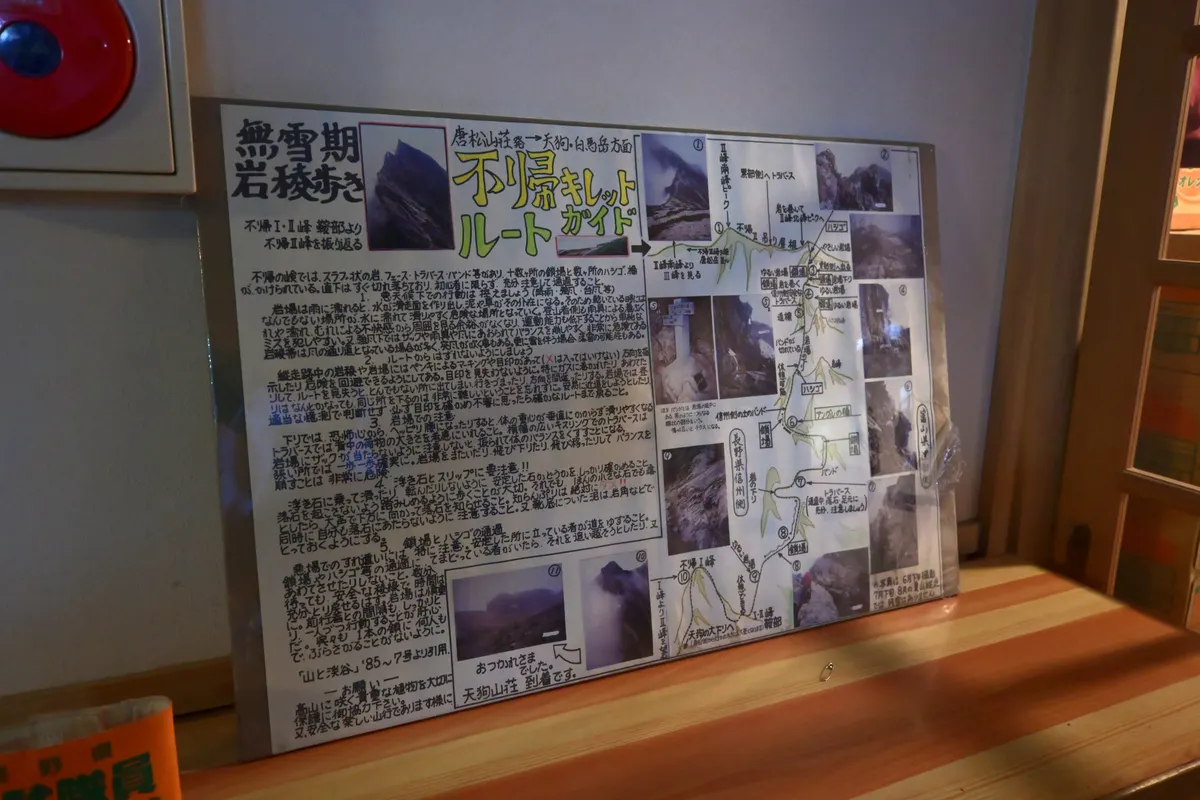 こちらは、山荘の中に展示してあった無雪期の岩稜歩きについてレクチャしてくれてる解説ですね。不帰キレッ卜は、目の前まで行きましたが、帰ってこれないと困るので見ただけです。^^;